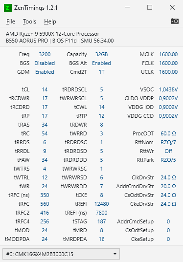 Ich musste am Nachmittag weg und habe Vdimm auf 1.37v eingestellt und Karhu laufen gelassen. Eben zurück und nach 6h 23 min und 14'755% kein Error. Perfekt. CADs sind bei mir auf Auto, glaube ich. Sind das die Werte unter ClkDrvStr, AddrCmdDrvStr, etc.?ZeroCoolRiddler schrieb:Stell Vdimm auf 1,36v und lass nochmal laufen. Da der RAM nicht mehr in den Stromsparmodus geht, ist er zwar zügiger, braucht aber evtl etwas mehr Spannung konstant.