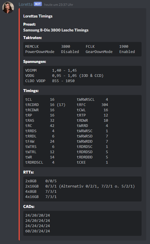 Wow, mit diesen Settings kann ich mit 3800 MHz booten. Außerdem konnte ich das Programm TestMem5 ohne Fehlermeldungen mehrere Minuten lang durchlaufen lassen. Ich hab dann noch den HCI Memtest mit 16 Anwedungen a 2000 Megabyte für etwa eine Stunde laufen lassen. Währenddessen hatte ich lediglich eine Fehlermeldung erhalten. Vor wenigen Minuten ist dann das ganze System wegen Überhitzung (CPU) abgestürzt. Ich konnte das System allerdings wieder starten.