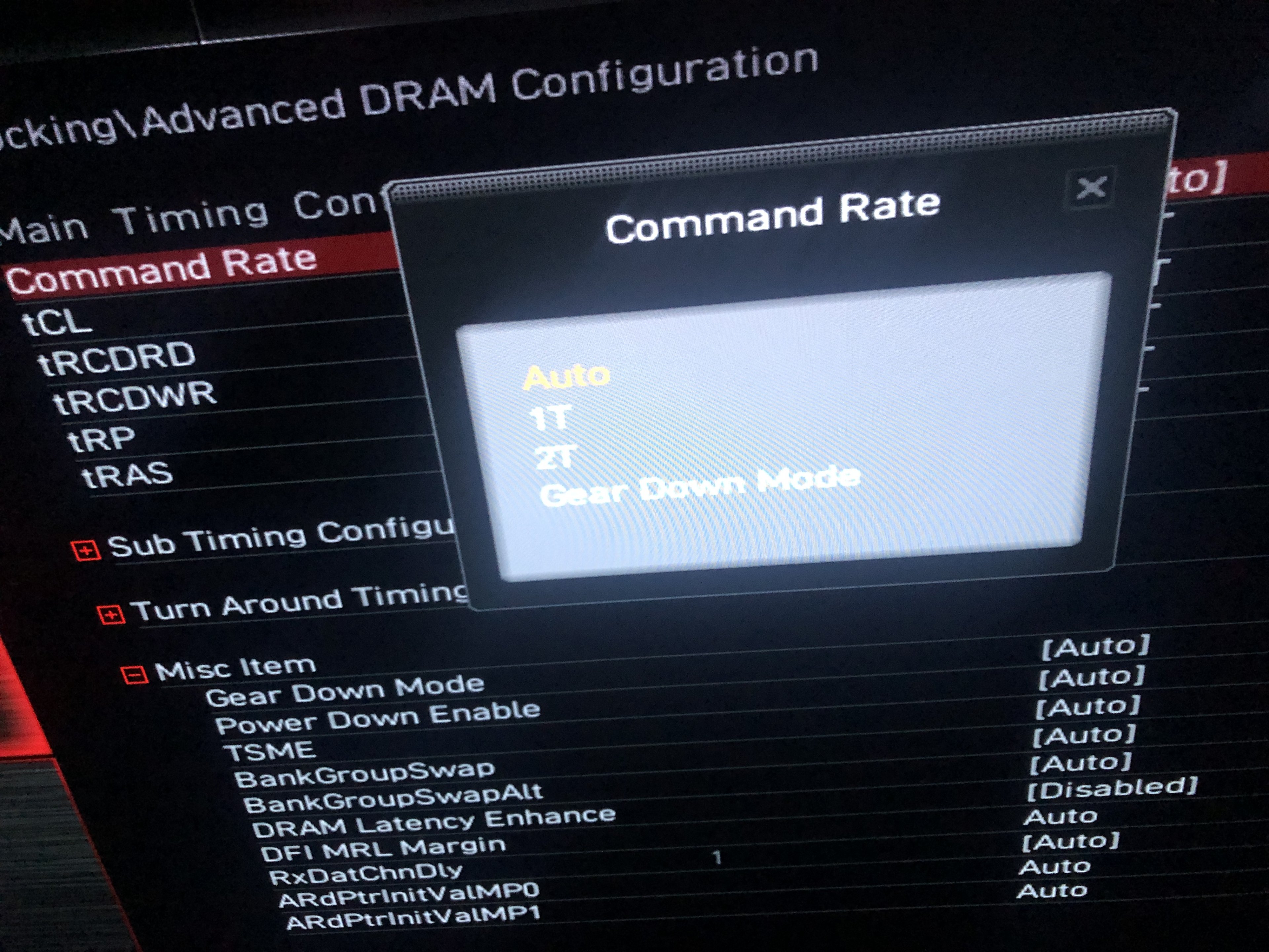 Ich habe zwei Optionen mit Gear Down Mode.....MehlstaubtheCat schrieb:Wenn du bei den Speichertimings (DRAM Timing Control beim MSI Board) ganz oben auf Gear Down Mode gehst wird der aktiviert (Enabled) und der Wert sollte dann 1T sein.