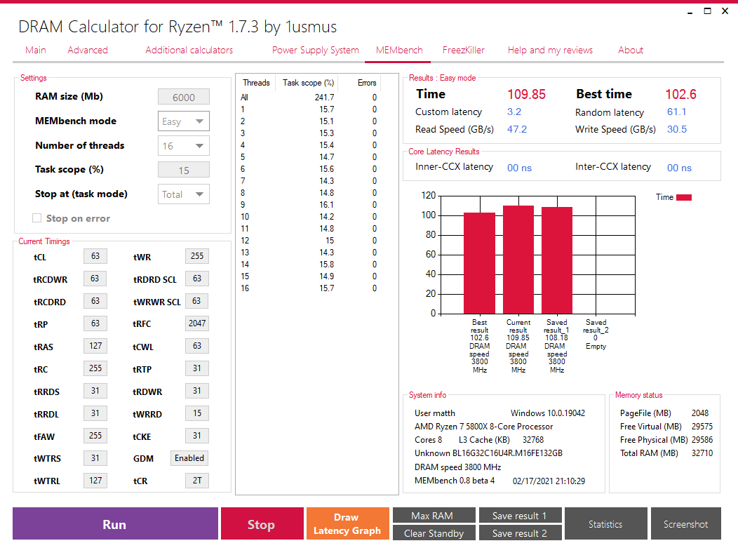 aber dram calc liest die werte komplett falsch aus, die ermittelten latenzen sind etwas höher, aber der benchmark speed passt ungefähr (das "saved result 1" zum vergleich ist mit f12 erreicht worden).