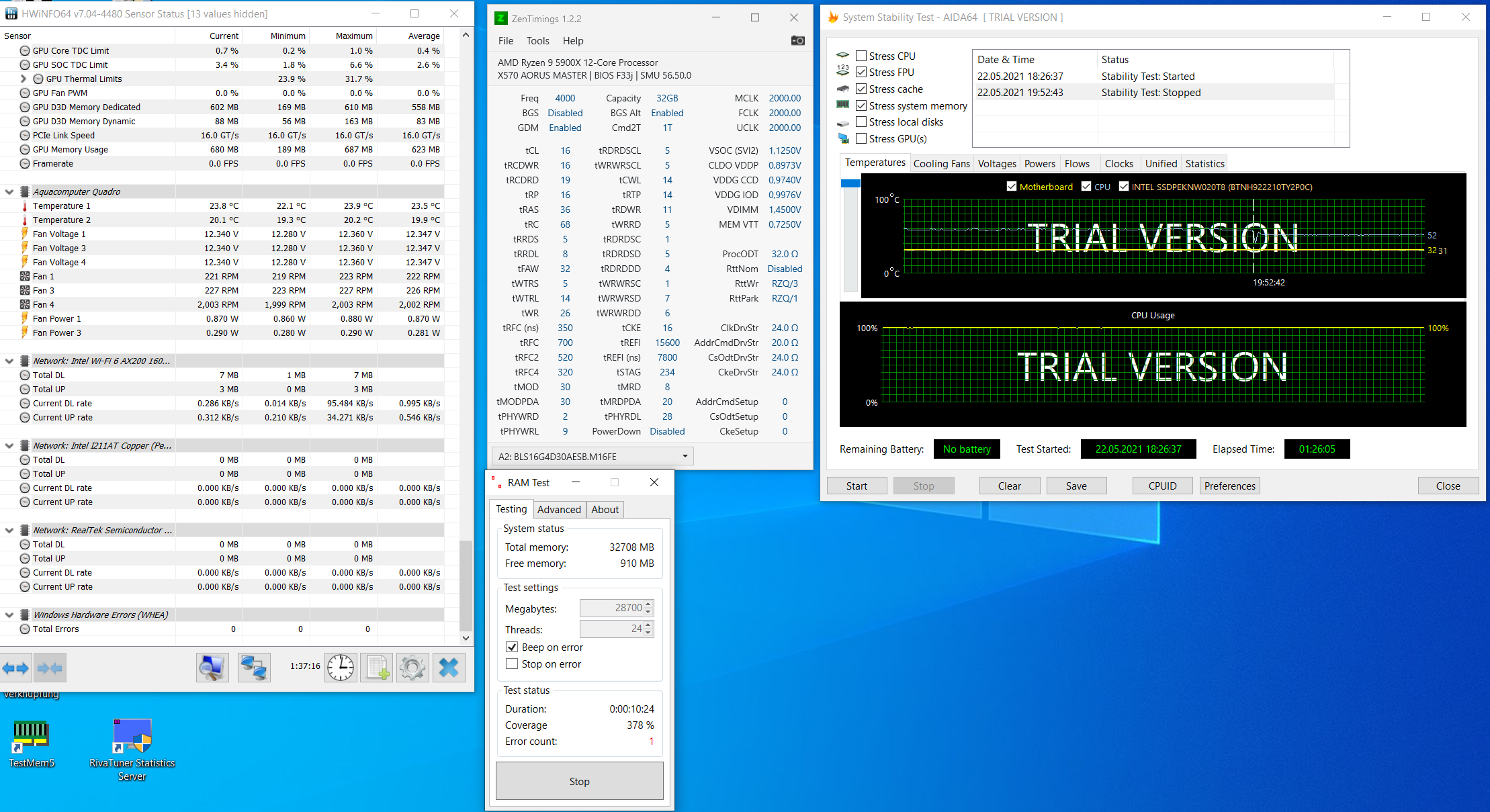 Allerdings scheine ich ein Temperaturproblem mit dem RAM zu haben. Selbst bei 4000Mhz mit 18-19-18-18-38-70 und 1,4V muss ich einen NF-P12 mit 1500RPM auf die Grafikkarte stellen, damit er den RAM anpustet. Mit anpusten gehen dann aber sogar 4000Mhz mit 16-19-16-16-36-68 mit 1,45V.