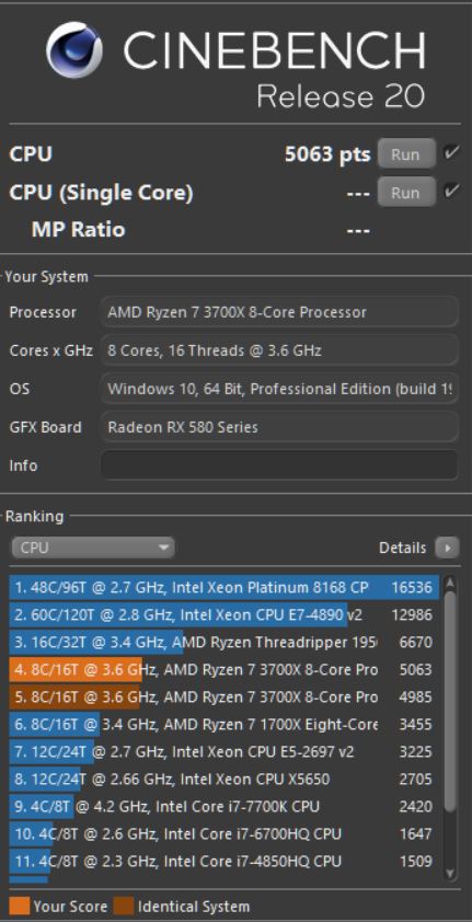 Anscheinend ein gutes Stück Technik erwischtmooquadrat schrieb:Wie kommste denn auf 5082 Punkte bei CB20? Habe auch die Ryzen 7 3700x + 3600 - CL18 Ram's (seit gestern, dank ZeroCoolRiddler) aber habe im Bench CB20 nur ca. 4780 Punkte. Habe PBO auf Standart. Hast du einen festen Takt gesetzt ca. +/- 4300?