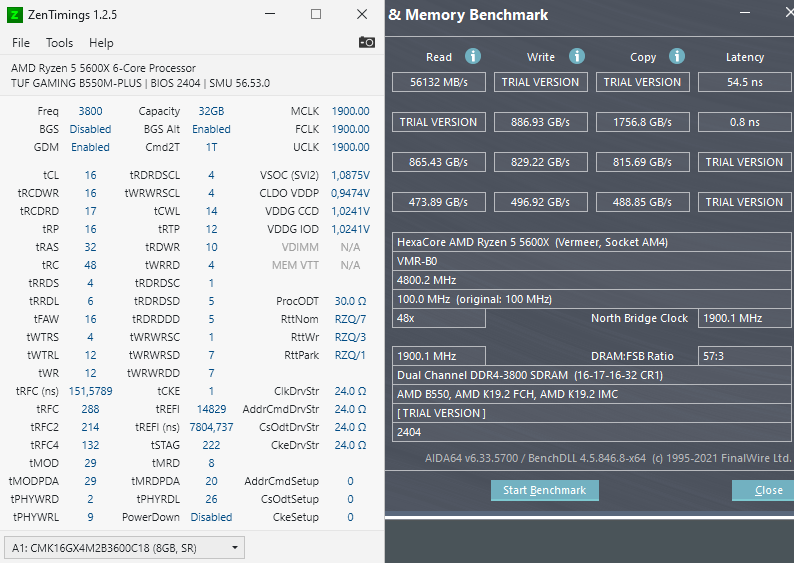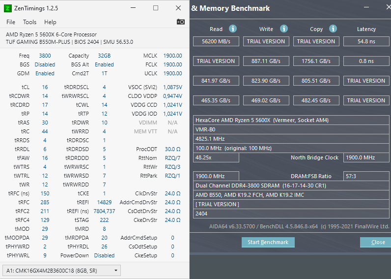 Kleines Update von meiner Seite. Anbei die Timings und die entsprechenden AIDA-Werte, die ganz typisch ausfallen. Mir ist aufgefallen, dass es zwischen den beiden Setups (16-17-14-14-30-44-285) und (16-17-16-16-32-48-288) keine nennenswerten Unterschiede gibt. Das laschere Setup hat sogar bessere Latenz-Werte...hmm?!