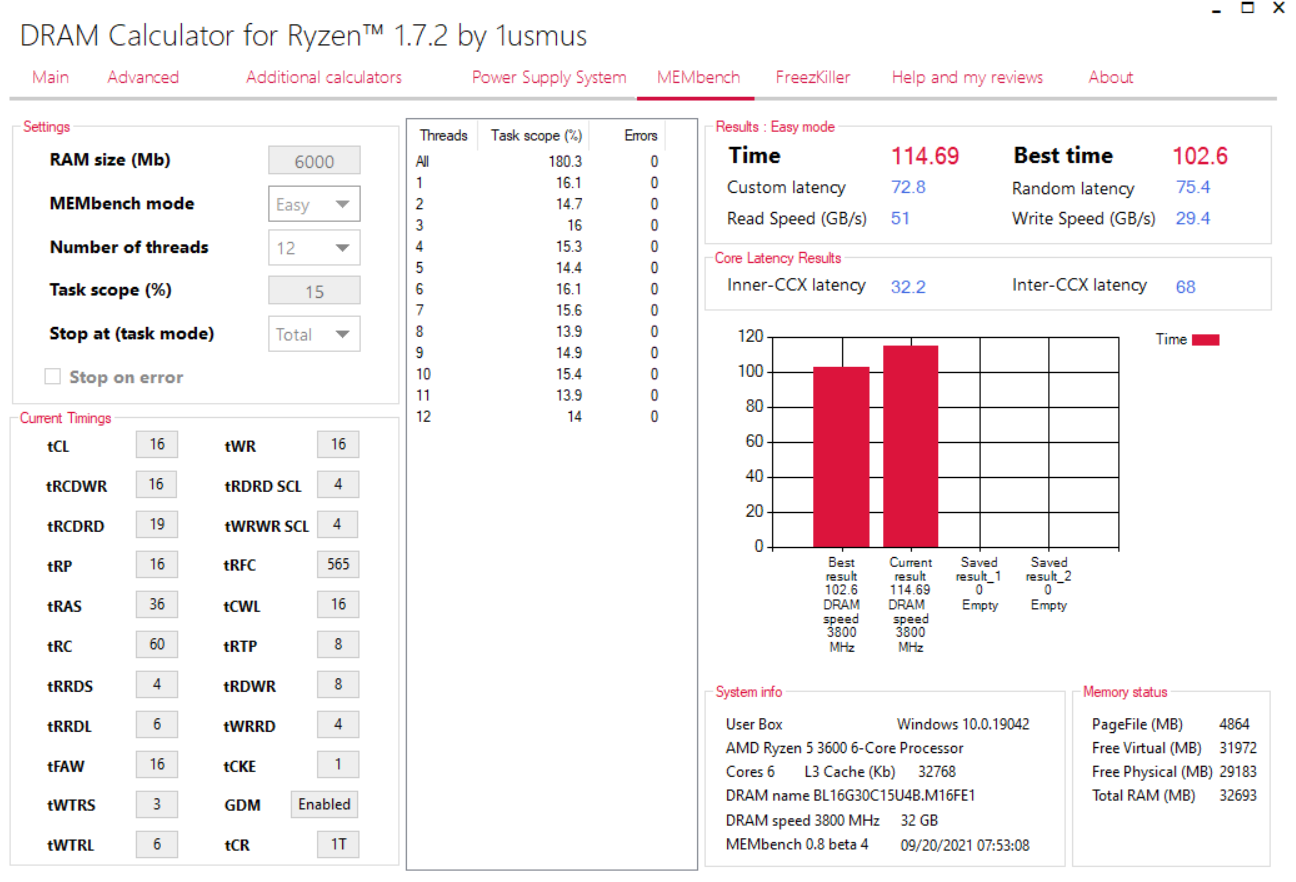 Guten Morgen, ich habe auf einmal schlechtere Latenzen (73 statt 68 ns), nachdem ich nach einem Biosupdate (neue Graka) alle Werte neu eintragen musste. Woran könnte das liegen, habe ich etwas übersehen?hurcos schrieb:So ich habe ein wenig getestet und das ist bisher das beste, stabile Resultat. tAber RFC will nicht unter 570 (565), sonst bootet die Kiste nicht, woran kann das liegen?