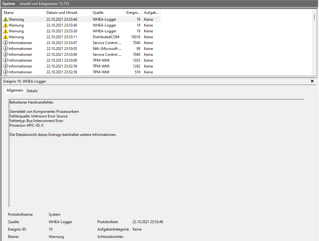 Hier der Whea-Logger. Davon kriege ich ab einem Fabric Takt über 1800mhz ca. 10 Stück pro Sekunde. Ist ja ein bekannter Fehler auf Zen3.