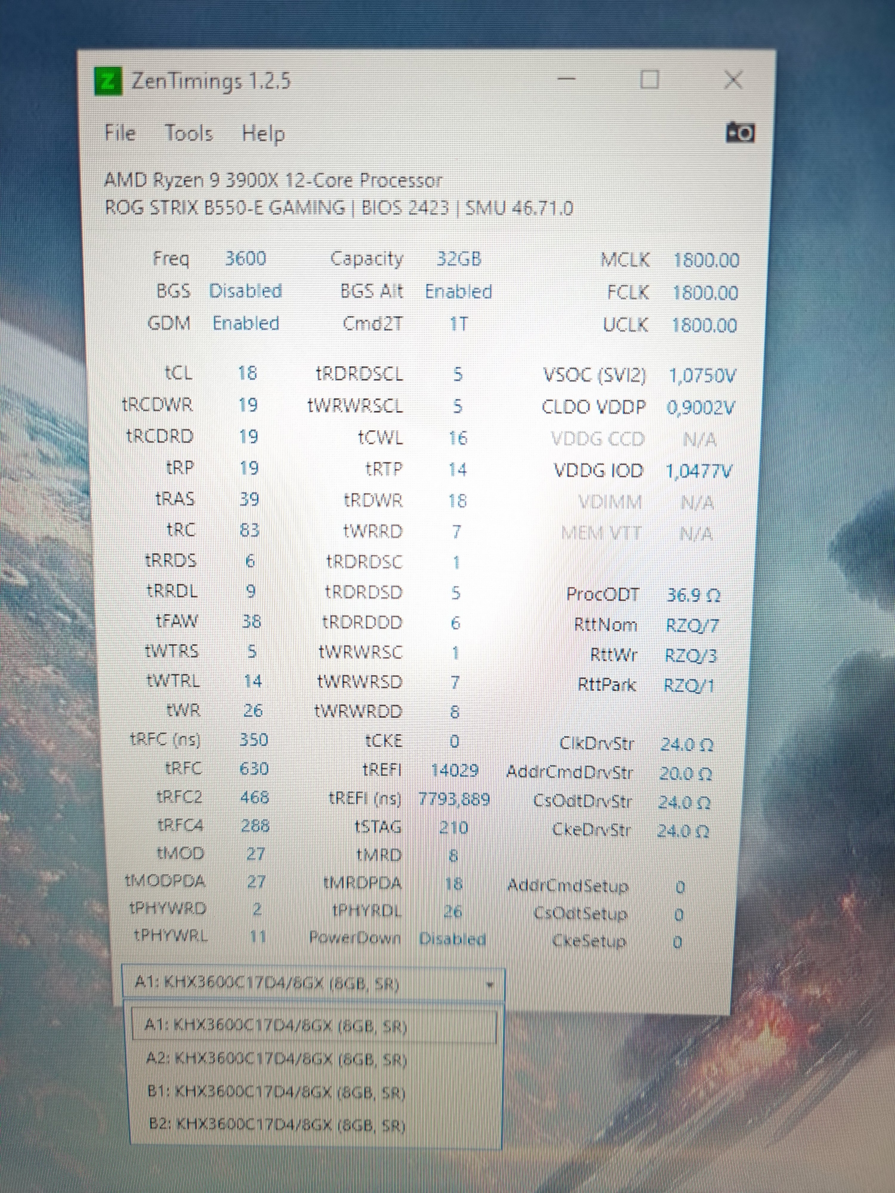 Hatte vor der Nachtschicht schnell Zentimings installiert und mit dem Handy ein Bild gemacht. Werde aber das nächste mal Screenshot machen. Wo ich 3800mhz im BIOS einstelle weiß.. Timings auch.. aber welche Timings nehme ich? Kannst du mir dabei vielleicht weiterhelfen?