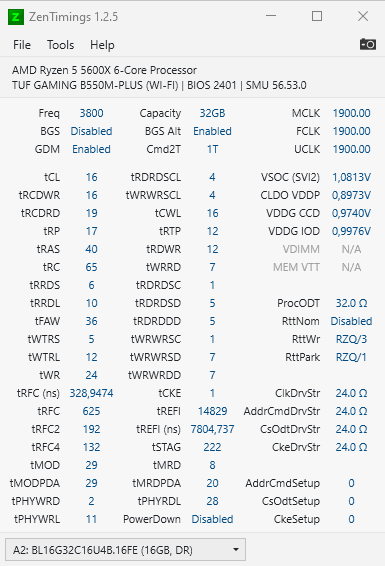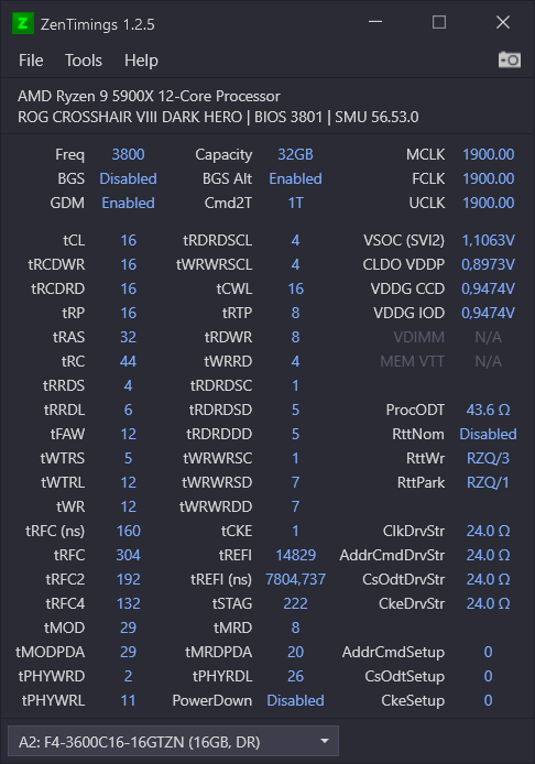 Die Timings liste ich hier mal nicht auf, sie entsprechen aber denen aus dem Post (siehe ZenTimings Screenshot) mit der Ausnahme, dass ich tRP = tCL+1 = 17 eingestellt habe, da es sonst immer direkt crasht.