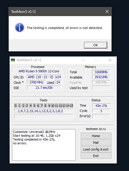 Letztendlich habe ich mich dann erstmal an das 3600er Lasch Preset aus dem Loretta Discord Channel gehalten, das habe ich stabil bekommen, allerdings erst mit 1,39V VDIMM. Habe erst mit 1,38V angefangen, aber das gab immer nach einer Zeit im TM5 Fehler und zusätzlich Bluescreens. Habe noch ProcODT von 32 bis 46 Ohm getestest, am stabilsten waren 36,9 und 40 Ohm, aber Fehlerfrei auch erst mit 1.39 V VDIMM. CAD Bus scheint mit 24/24/24/24 am besten zu laufen, zumindest nach dem was ich mit 1.38 V gesehen habe, ist aber schwer für mich zu beurteilen, weil es da grundsätzlich nicht stabil war, und bei 1.39V direkt beim ersten längeren Test mit 24/24/24/24 unter AIDA und TM5 @anta777 Fehlerfrei war.