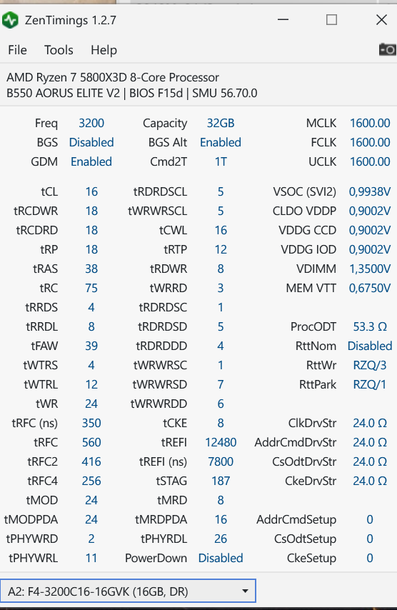 Jetzt bin ich bei 3800 Cl16 GDM on geendet, aber noch mit zwei weiteren Riegeln also jetzt 64GB und bei 1,44V.