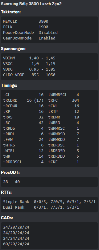 @Garrus Mein 3600er C14 Setting ist stabil. Jedoch mit 1.475 DRAM Voltage. Habe halt gehört man sollte den Ram aus Stabilitätsgründen möglichst unter 50 Grad halten. Ich lande bei 55 Grad. Deshalb würde ich die Spannung gern senken. Aus dem Grund wurde mir ja auch geraten, 3800 oder 3733 zu probieren. Da bekomme ich jedoch keinen Post auf die Kette.