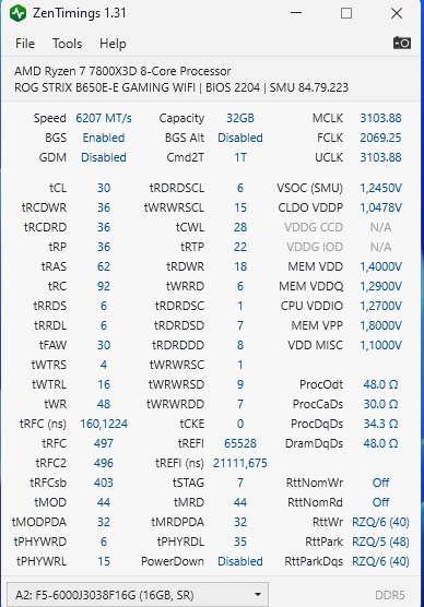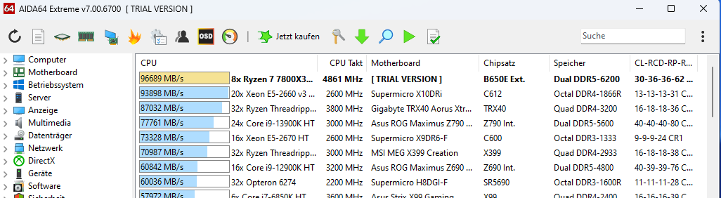Mein 32GB Kit mit G.Skill F5-6000J3038F16GX2-FX5 CL30-38-38-96 haben aktuell lt. AIDA64 Trial folgende Werte: