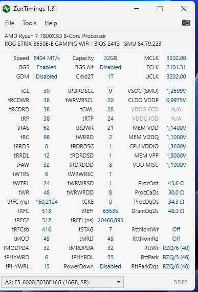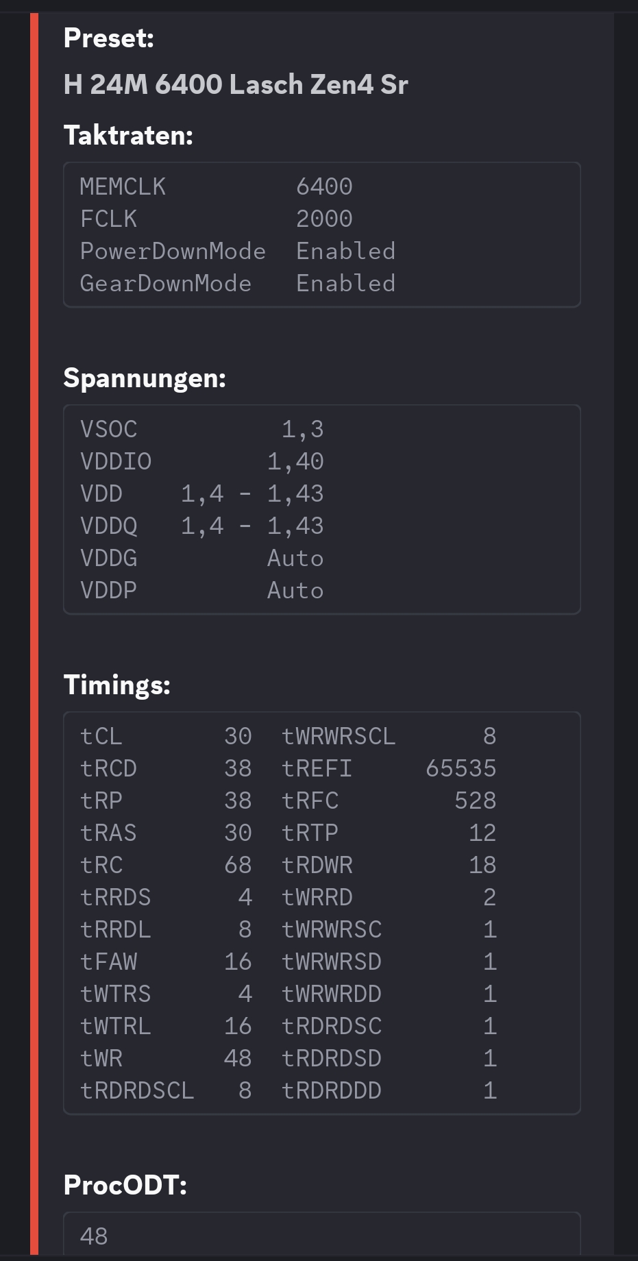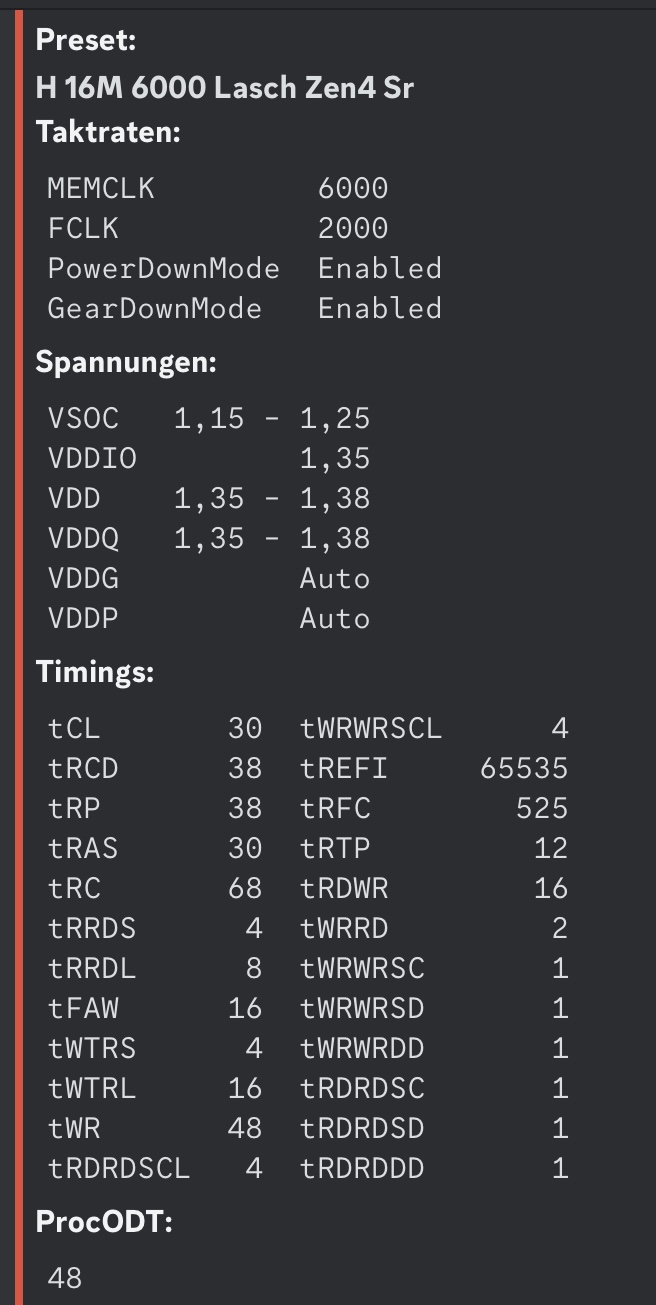 Habe eine Kombination aus @Jaffech's Timings (er verwendete seine bei 6400 MT/s, ich 1:1 bei meiner 6000 MT/s Konfiguration) und @ZeroCoolRiddler's 6000 MT/s HM16 "Easy-Peasy" Config, die seiner Aussage nach stabil durch jeden Test lief, gewählt. Von Letzterem habe ich aber lediglich die Werte für Spannungen und Widerstände 1:1 übernommen - bis auf die SoC-Spannung, welche ich niedriger wählte, weil @ZeroCoolRiddler auch wesentlich straffere Timings nutze. Bilder von den beiden: siehe unten. Hat auf Anhieb problemlos geklappt. Mir ging es ja wie gesagt um zwar gute Leistung bei der aber eher die Stabilität im Vordergrund steht. Die "3D"-AMD-Modelle sollen ja eh nicht sooo extrem viel vom Speichertiming-Tuning profitieren. Aber zumindest 6000 MT/s wollte ich schon mitnehmen (die Riegel sind ja sogar für 6400 MT/s spezifiziert - aber wie gesagt "Stabilität" war mir wichtiger.