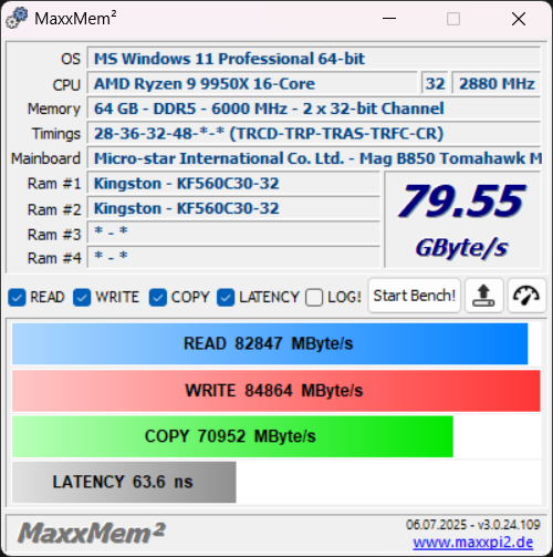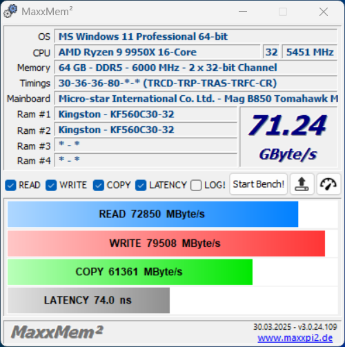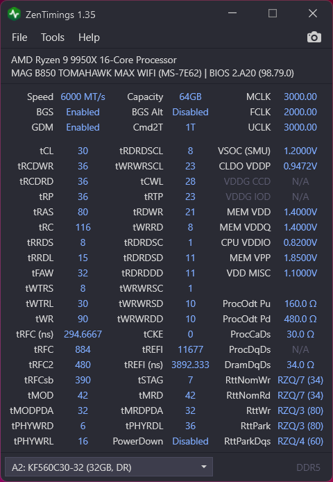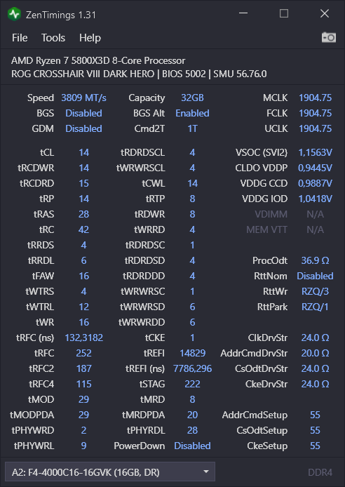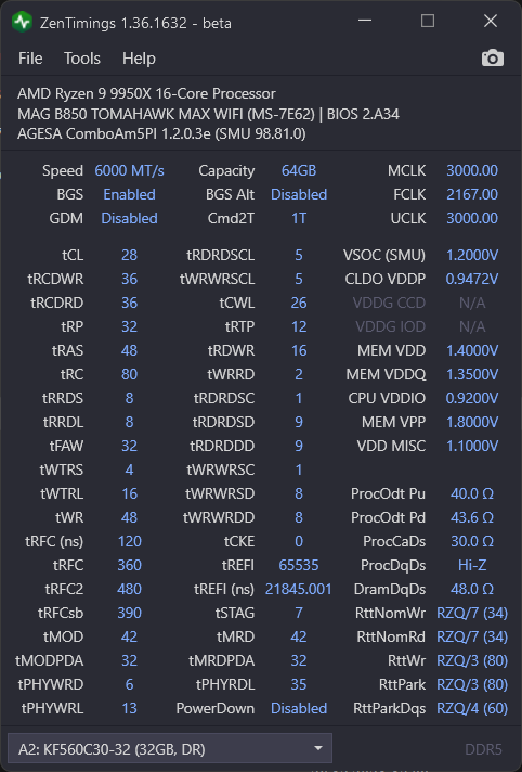 Hab mal Deine Timings 1zu1 übernommen. Nur die Spannungen noch nicht. Ist gleich ohne Probleme hochgefahren. AIDA Werte sind um ca 500mb/s hoch. Also read und copy. Latency ist bei 54-55ns geblieben.MehlstaubtheCat schrieb:Bei dir sind viele Timings "Überdreht" und kosten Leistung.