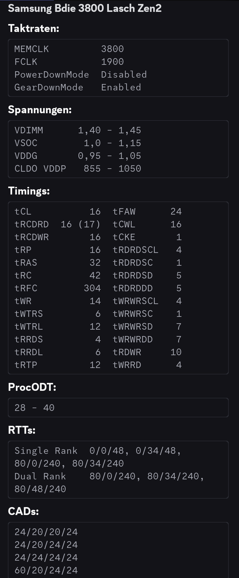 Hab gedacht, ich gehe mal auf gut Glück direkt auf 3800 MT/s. Das hat bei mir bei meinen alten Crucial Ballistix (2x16 GB) funktioniert - nach den Timings hier: der Mix (guter Kompromiss) 3800 1,38-1,39v