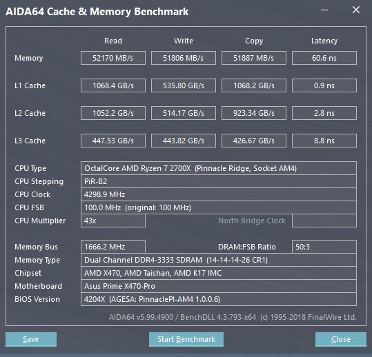 Ich kann zwar nicht mit deinem super Ergebnis mithalten, aber zumindest konnte ich heute die 61ns bei 3333Mhz durchbrechen bei Vollbestückung. Wobei man sagen muss, dass das nicht auf Grund des RAM ist, sondern auf Grund der CPU. Ich dachte, da ich eh auf das crosshair (wurde endlich versendet) warten muss, probiere ich nochmal mehr an der CPU rum, und siehe da: Mit LLC4, 1,43125v und CPU switch frequency (letztes war am wichtigsten) auf 450 läuft die CPU auf 4,3Ghz stabil.