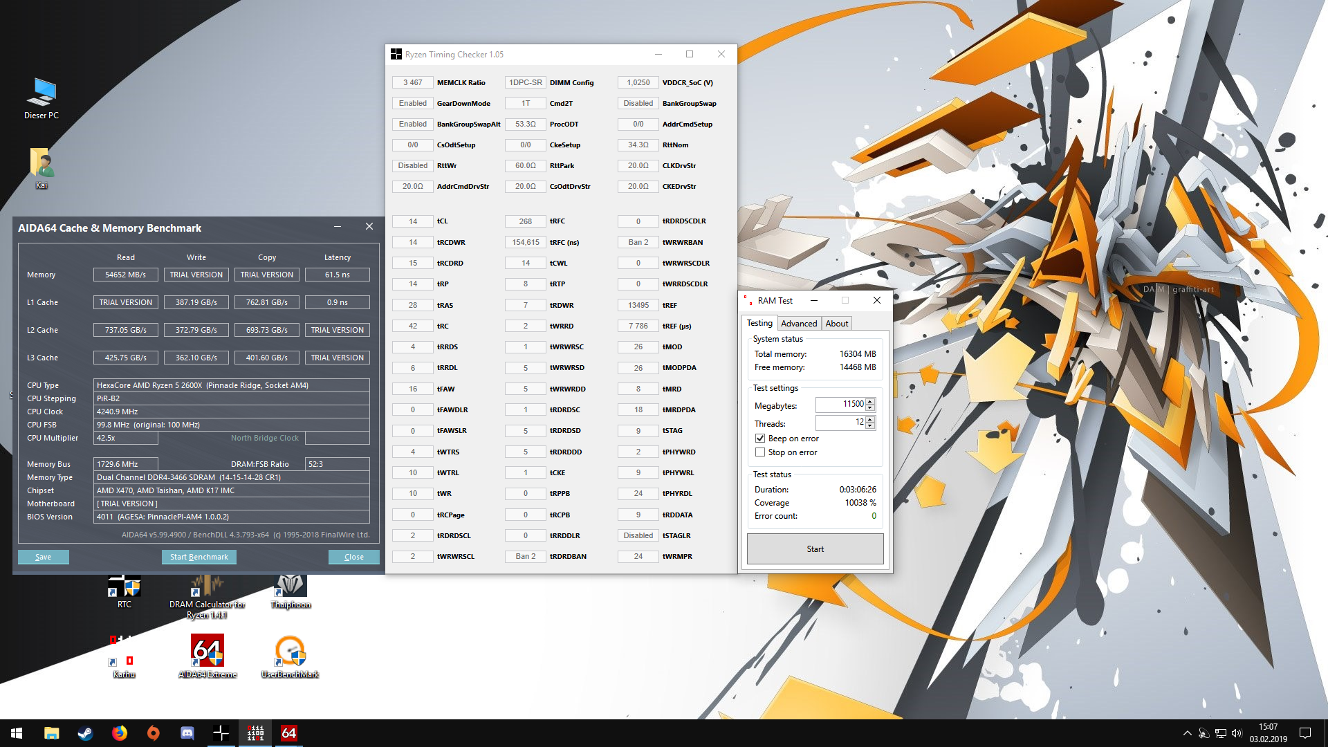Getestet habe ich den Ram erst auf 2400CL16, dann auf 3200CL14 und danach auch noch 3466Cl14. Alles lief wie geschmiert. Ich habe jeweils ein Aida64 Benchmark (Free Version) gemacht und dann noch den Benchmark von AC Odyssey. Hier sind die Ergebnisse: