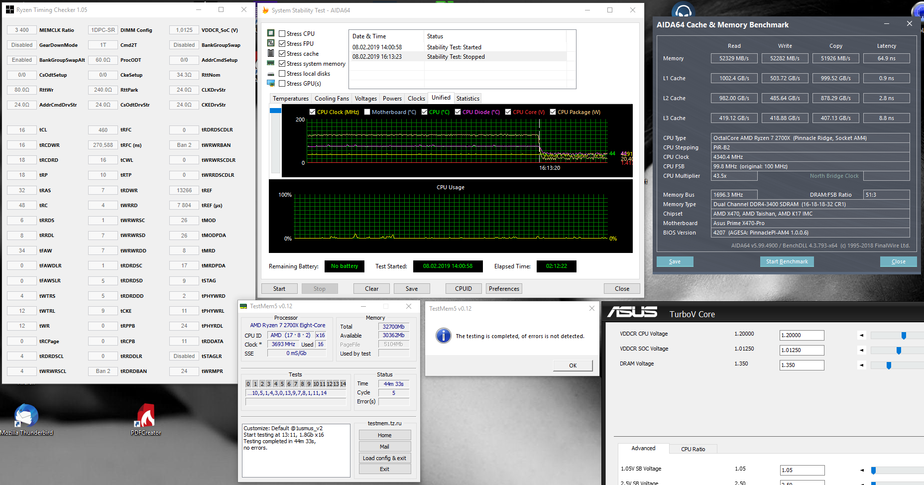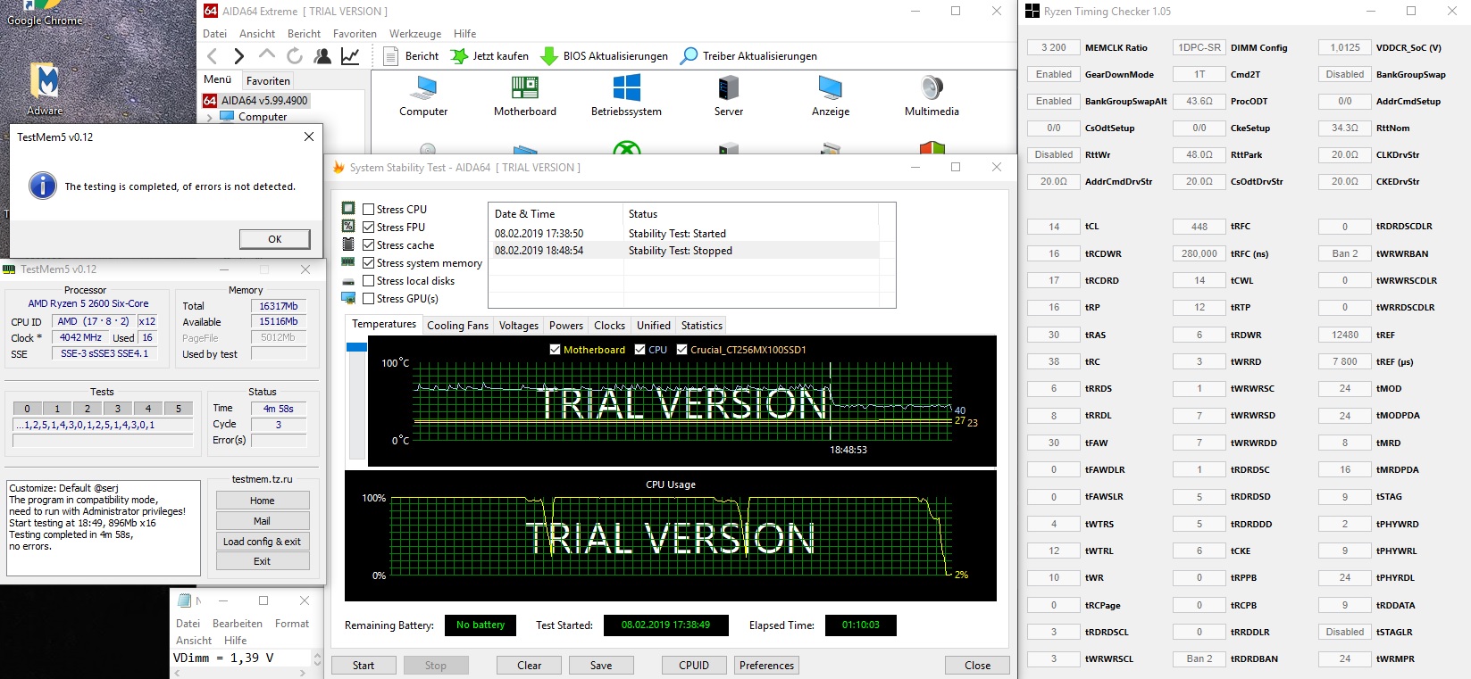 Ich hatte eigentlich keine hohen Erwartungen an meinen RAM, bin aber doch überrascht, dass bisher alles stabil zu laufen scheint. Folgen Einstellungen laufen zumindest schon mal AIDA/Mem5 und Battlefield5 stabil (Karhu muss ich mir am Wochenende mal zulegen)