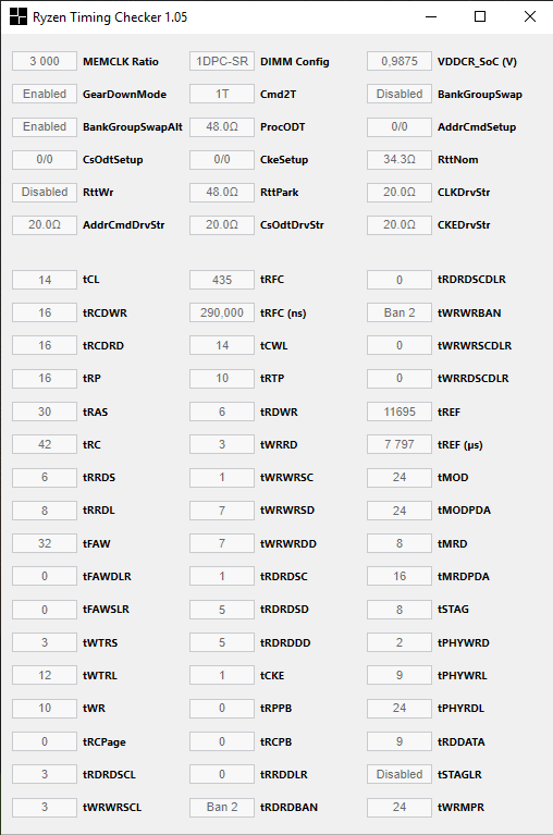 Auf jeden Fall klappt der Boot schon mal direkt ohne Probleme und mit VDimm = 1,34 V, VSoC = 0,9875 V und ProcODT = 48 ist da noch viel Luft nach oben um das stabil zu kriegen. tRFC von 420 wollte natürlich überhaupt nicht booten, auch mit mehr VDimm nicht, aber 435 ist jetzt nicht sooo viel höher