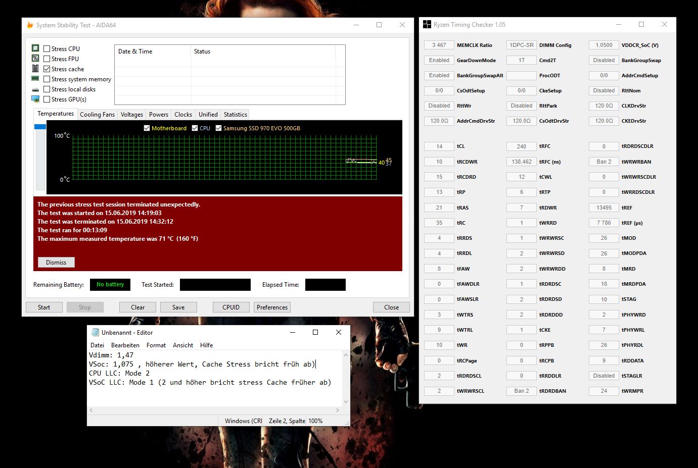 äääh , deine CPU ist instabil ..., du hast bei Aida nur den Cache getestet und der sitzt in der CPU .... , der Abbruch kann somit nichts mit dem Ram zu tum haben , ( höchstens indirekt , weil die CPU mehr Power braucht wenn der Ram Takt hoch geht )Hopie schrieb:Neuer Tag, neuer Versuch ^^
