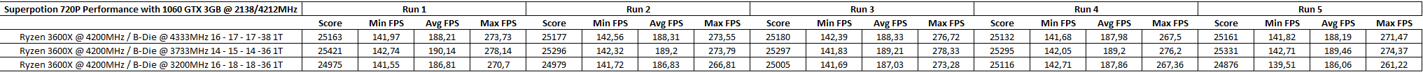 Falls es jemand interessiert, habe eine Benchreihe mit Superpotion 720P gemacht, leider ist das wohl nicht bestcase was Ramtakt betrifft, aber ich denke man erkennt trotzdem was am schnellsten ist.
