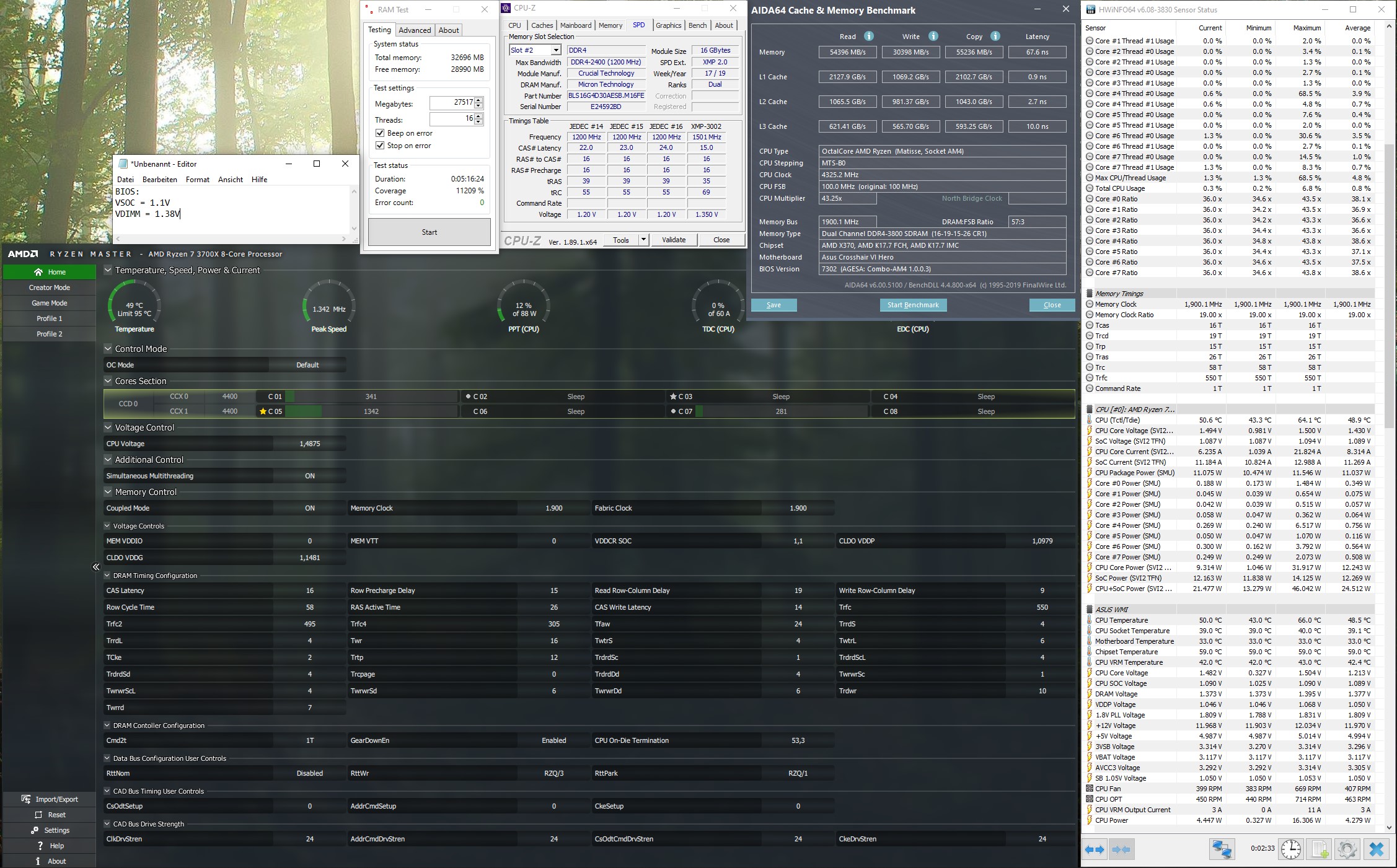 Ob noch mehr geht? Ja, mit ganz viel Spannung lässt sich noch etwas rausholen. 3733CL14 kann man auf jeden Fall booten und benchen und vielleicht auch stabil bekommen. Lohnt sich nach meinen Messungen aber überhaupt nicht, v.a. da man dann eher Richtung 1.5V drauf gibt.