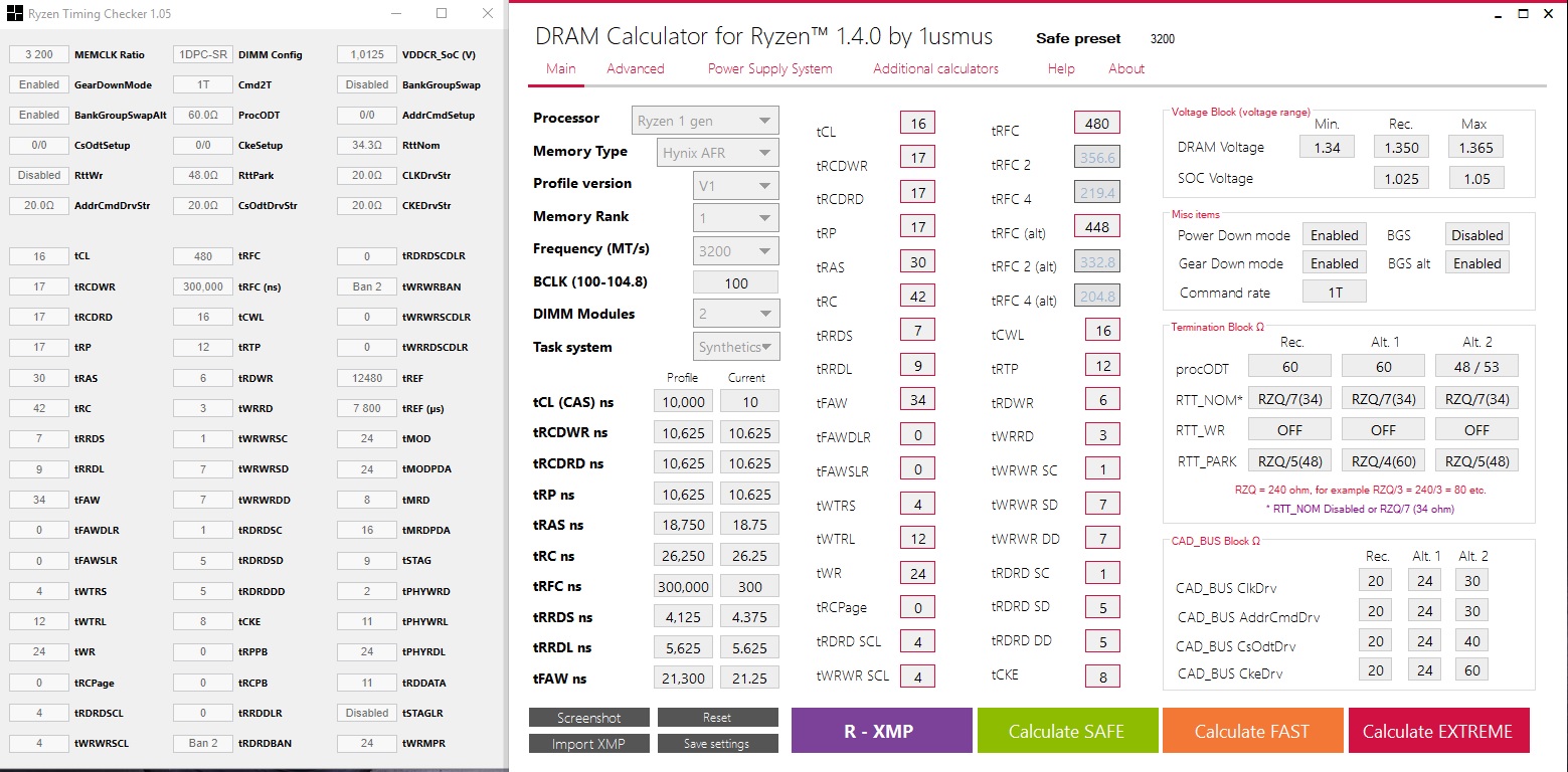 Ich habe zum Testen zunächst mal wieder das XMP Profil und 3200 MHz ausgewählt. Die Timings und Impedanzen per Ryzen Calculator safe berechnet und alles eingetragen (auch erstmal 60 Ohm). Die Ram Spannung habe ich bei 1,35 V belassen. Da das manuelle einstellen der SoC Spannung nicht funktioniert hat, habe ich wieder den offset von -100 mV benutzt. Der Test mit Aida lief zunächst ohne Fehler. Irgendwas stimmt aber mit der Stabilität trotzdem nicht. Vorhin wollte er erst nicht booten und hat den Takt wieder gesenkt. Ich habe dann manuell wieder auf 3200 MHz gestellt und seit dem läuft es. Ich habe mehrfach rebootet, aber kann den Fehler nicht reproduzieren. Zufriedenstellend ist das aber bisher noch nicht.