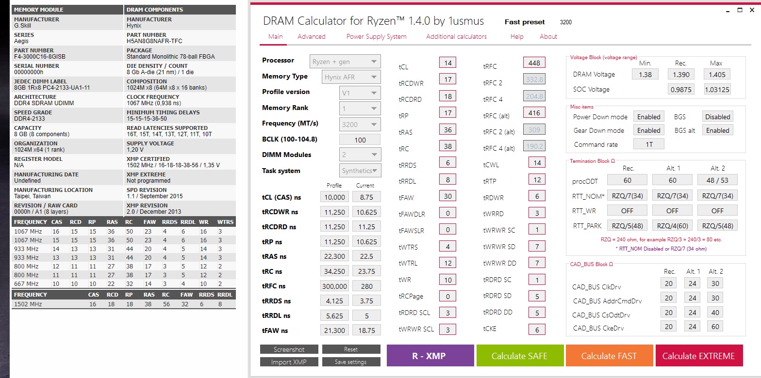 Daniel1337 schrieb:Importier mal das XMP Profil, stell Hynix AFR, V1 und calculate safe ein. Dann müssten eigentlich die selben Werte wie bei mir raus kommen.