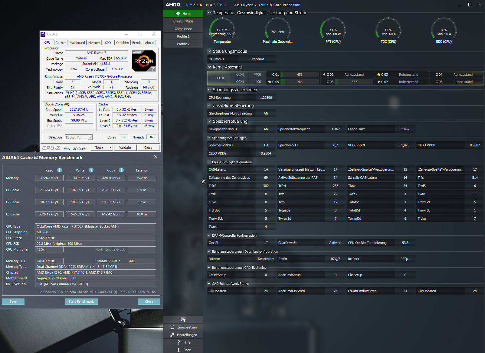 Was jetzt allerdings läuft ist das Safe-Setting aus dem Calculator für 2933Mhz - das war vorher nicht drin. Heißt: Gleicher Takt wie mit dem alten Bios, aber schnellere Timings. Allerdings gleichen bis (wiederholbar) minimal schlechterer Performance bei AIDA xD