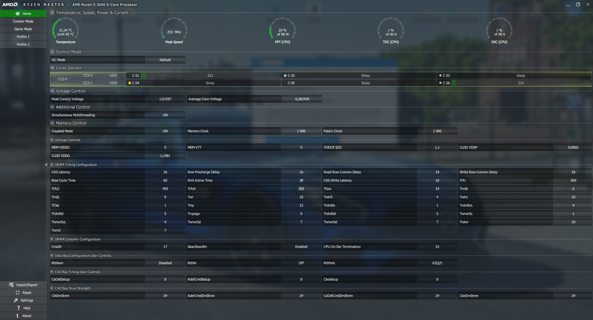 Vorerst mal wieder das 3600er (V1 Safe aus dem Ryzen Calc.) Profil geladen.