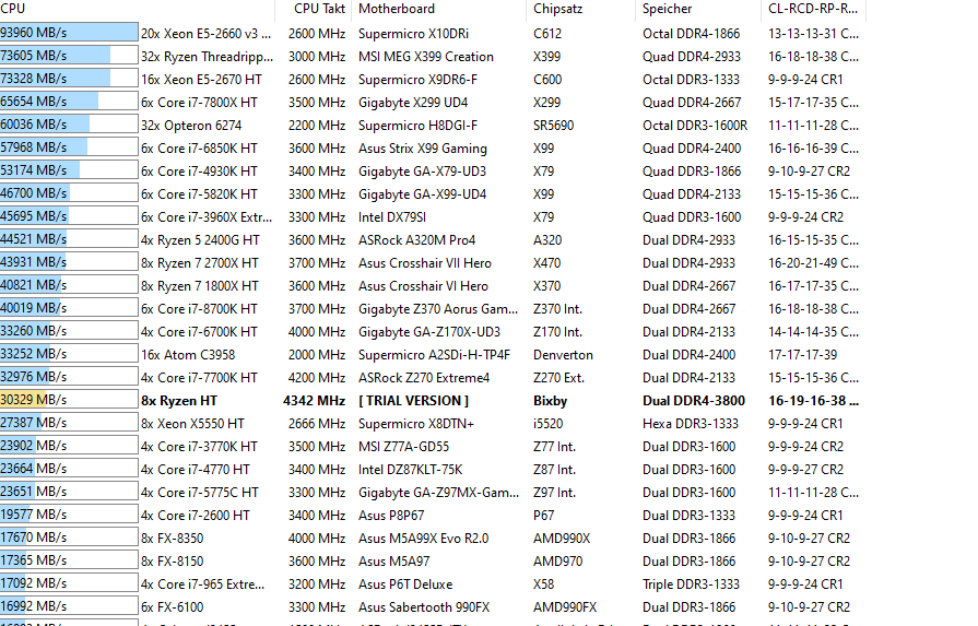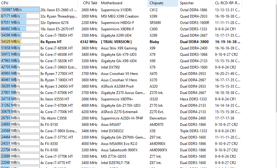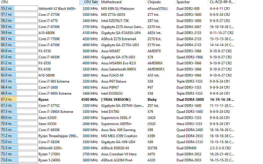 A: 54681 MB/s Read, 67,6ns Latenz (ich habe nur die Free Version, daher keine anderen Werte)