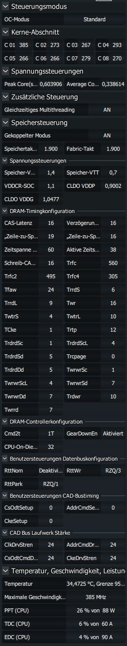 Wie von dir empfohlen musste ich aber tRCDRD auf 19 hochsetzen. Gebootet hat er von Anfang an, aber ich habe mit AIDA64 und Karhu direkt Fehler bekommen für tRCDRD<19. Ich hatte versucht die Voltages hoch zu setzen, aber bei SOC 1.15V, VDDG 1.10V, und DRAM Voltage 1,50V, hatte ich Sorge höher zu gehen und hab angefangen tRCDRD hochzusetzen. Nachdem weder AIDA64 noch Karhu auf Anhieb einen Fehler ausgeworfen haben, bin ich nochmal zurück ins Bios und hab die Voltages wieder runter gefahren: SOC 1.10V, VDDG 1.09V, und DRAM Voltage 1,45V, und siehe da (mit tRCDRD=19) gebootet, keine schneller AIDA64 Fehler und Karhu mittlerweile bei 1000%.