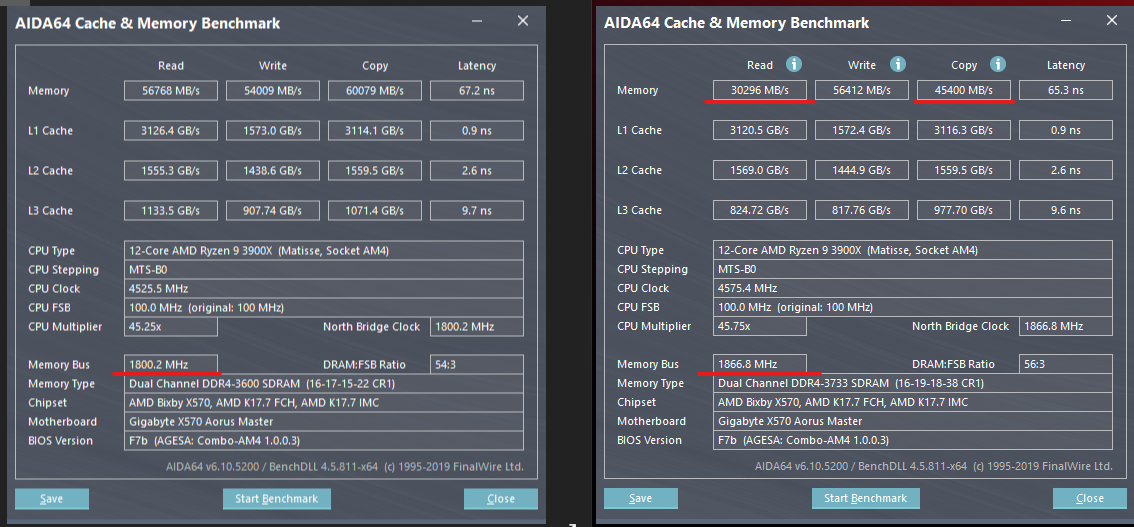 Kenobi schrieb:Weiß zufällig jemand, woran das liegen könnte? Beide RAM-Settings sind auf Stabilität geprüft, aber ich habe plötzlich deutliche Read- und Copy-Unterschiede, wenn ich von 3.600 auf 3.733 hochgehe. IF und RAM laufen synchron, aber 3.733 mit lockereren Timings. SOC hab ich auch testweise erhöht und auch mal tRFC und die SCLs gelockert, ohne Unterschied.