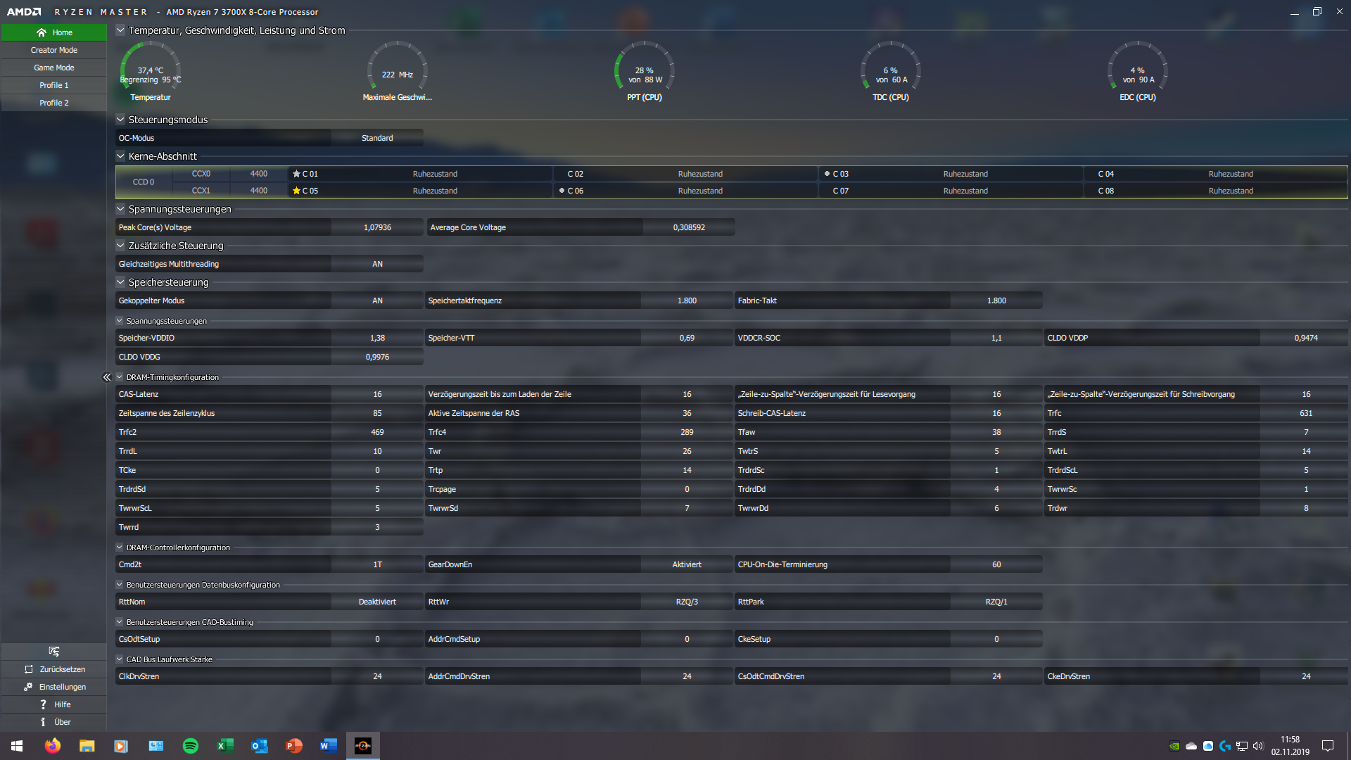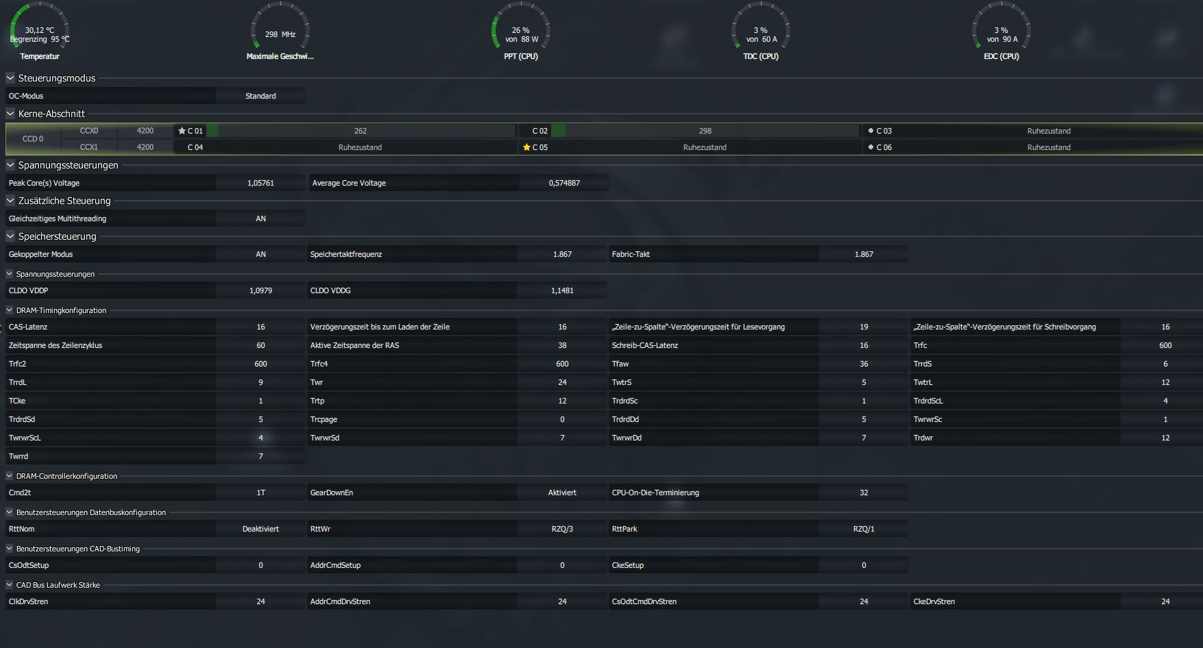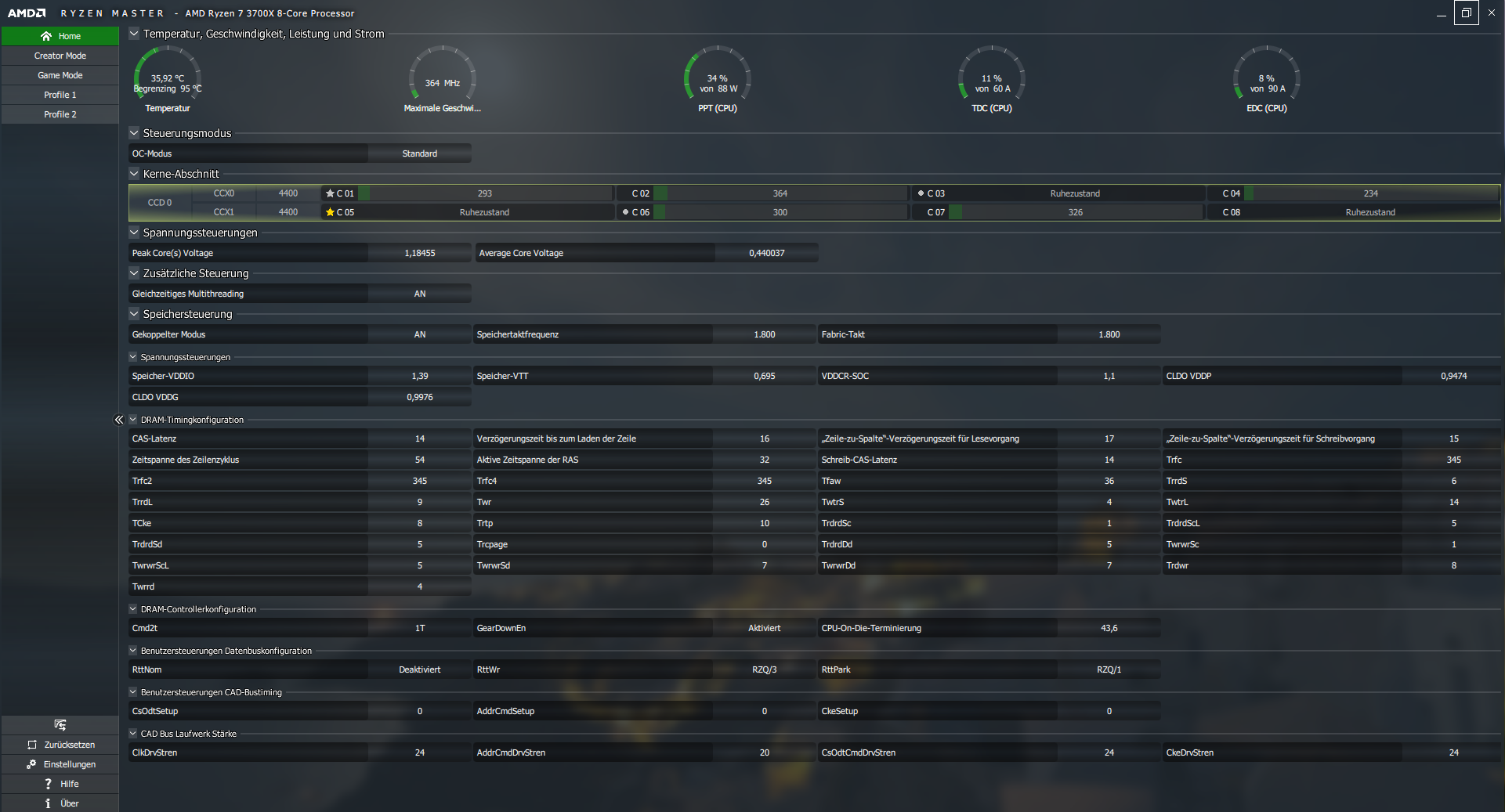 So ich habe jetzt karuh mit den sanften Timings zu 3733 bis zu 10.000% ohne Fehler laufen lassen. Der RAM war nach 6 Stunden wieder nur 40C warm. Soweit bin ich schon ganz zufrieden. Werde die Werte jetzt alle so lassen, soweit ich alles richtig eingetragen habe. Hier nochmal ein Bild aus dem Ryzen Master. Hier sollte dieses Mal alles stimmen, oder?