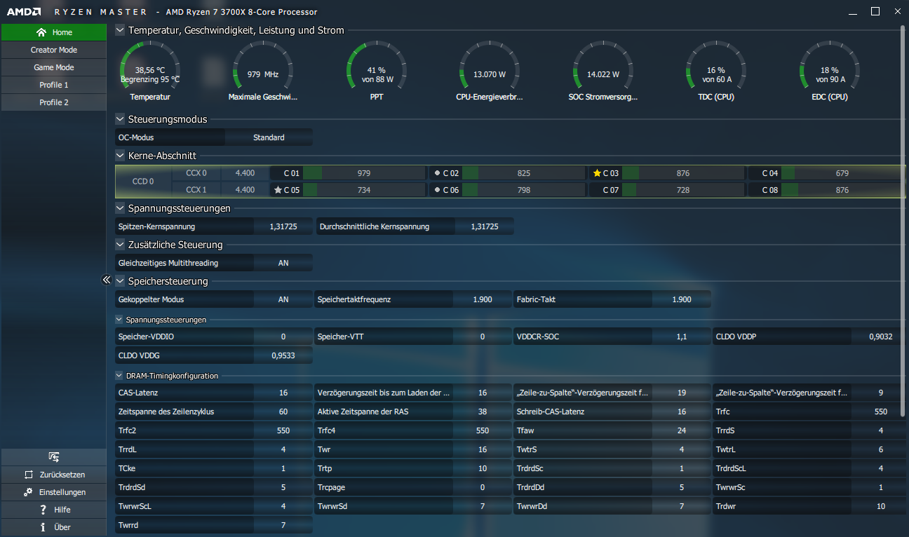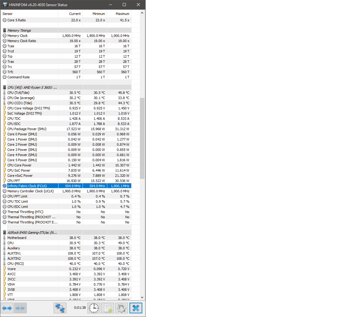 @SpyderHead Es gibt nen gaaanz einfachen weg festzustellen ob IF mit 1900 läuft oder nicht. Gehe ins Bios lad die setup defaulds, so das der Ram mit Jedec läuft, den wollen wir hier nicht testen, Stell VDDG VDDP auf 0,95 bis 1Volt ein SOC und ganz wichtig SOC/UnCore auf 1,05 das sollte dick reichen. Dann stellst du NURnoch den IF erst mal auf 1800. ( bei1900 kannes sein das das Board nicht will) Save & exit. Sofort wieder ins Bios und 1900 einstellen und Save & exit. wenn er jetzt ions Windows kommt Aida Stresstest, da nur bei Cache ein Häkchen und eine Halbe >Stunde laufen lassen. Wenn er das schafft steht dem 3800 Ram nichts mehr im wege.