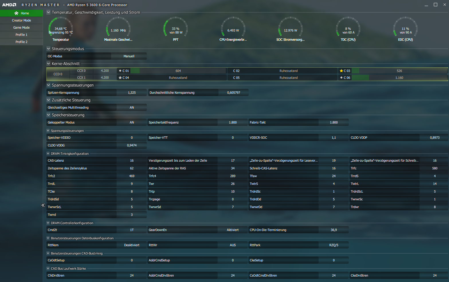 Bei Zen+ ist eine ProcODT von 53,3 keine Seltenheit gewesen, ich selbst habe für stabile Ergebnisse meist sogar 60 Ohm benötigt. Von daher kannst du da ruhig noch etwas nach oben, das hilft oft der Stabilität.Marcool schrieb:Bei 3533Mhz musste ich von ProcODT 40 auf 44 (glaube ich; eins unter 48; Rechner steht auf der Arbeit) gehen.