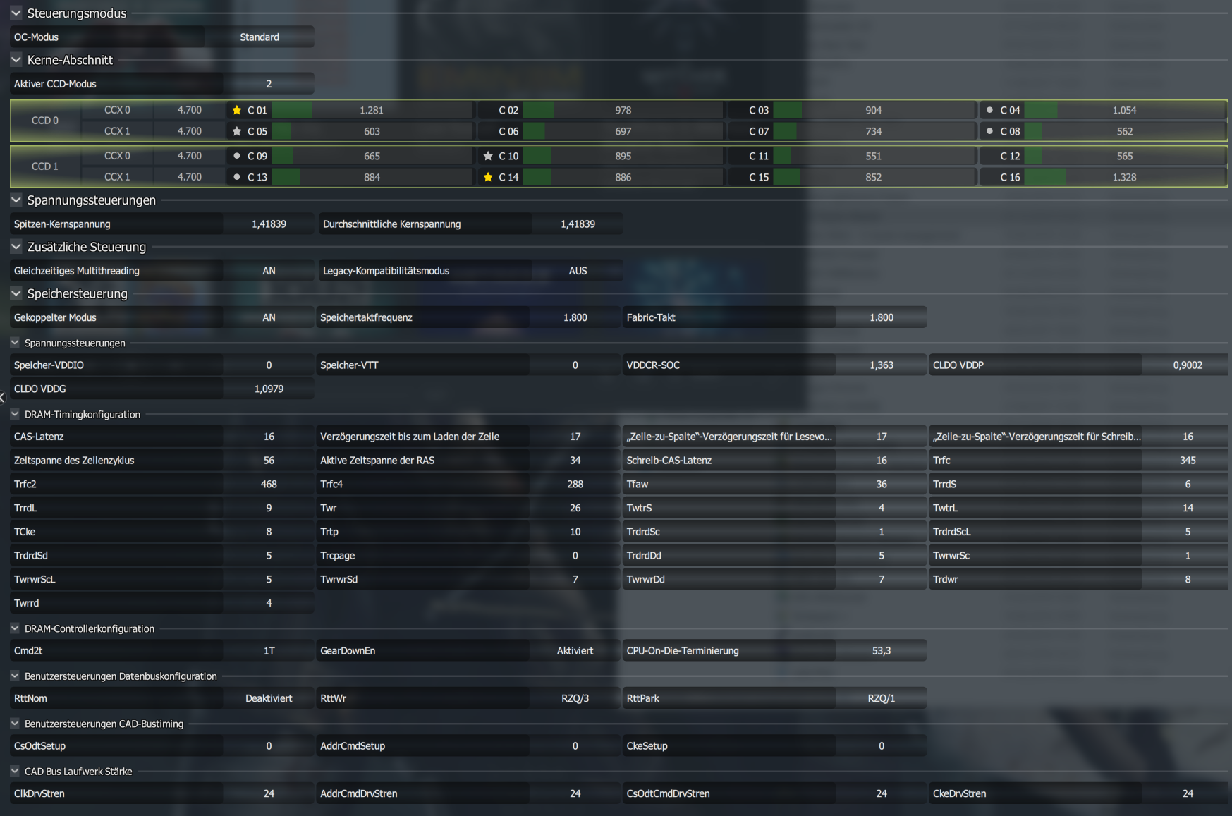 Das kann ich gut nachvollziehen. Hab mal CAD Bus & RTT Werte fixiert. Bei ProcODT mochte mein Ram (oder der IMC?) die Werte unter 40Ohm gar nicht. Unter 100% bei Karhu kamen bereits Fehler. Die 43,6Ohm laufen jetzt schon >1400% ohne Probleme.... ich nähere mich an