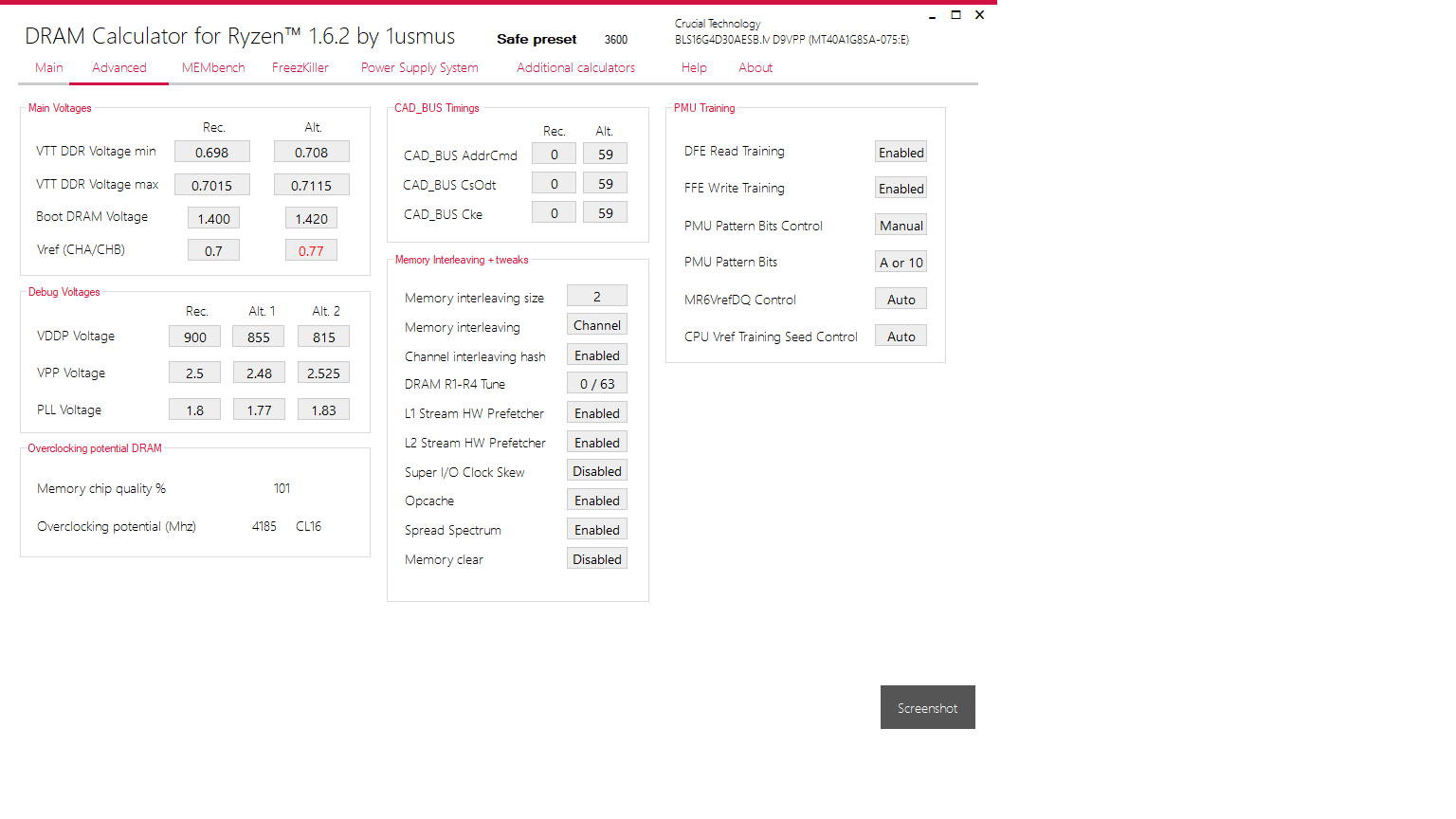 3600 läuft nur mit tRCDRD 19, läuft nun 16-19-14-14-32 bei 1,4V, 1,0V VDDP/G. Die Spannungen werd ich noch weiter runter setzen, bis es Fehler gibt.