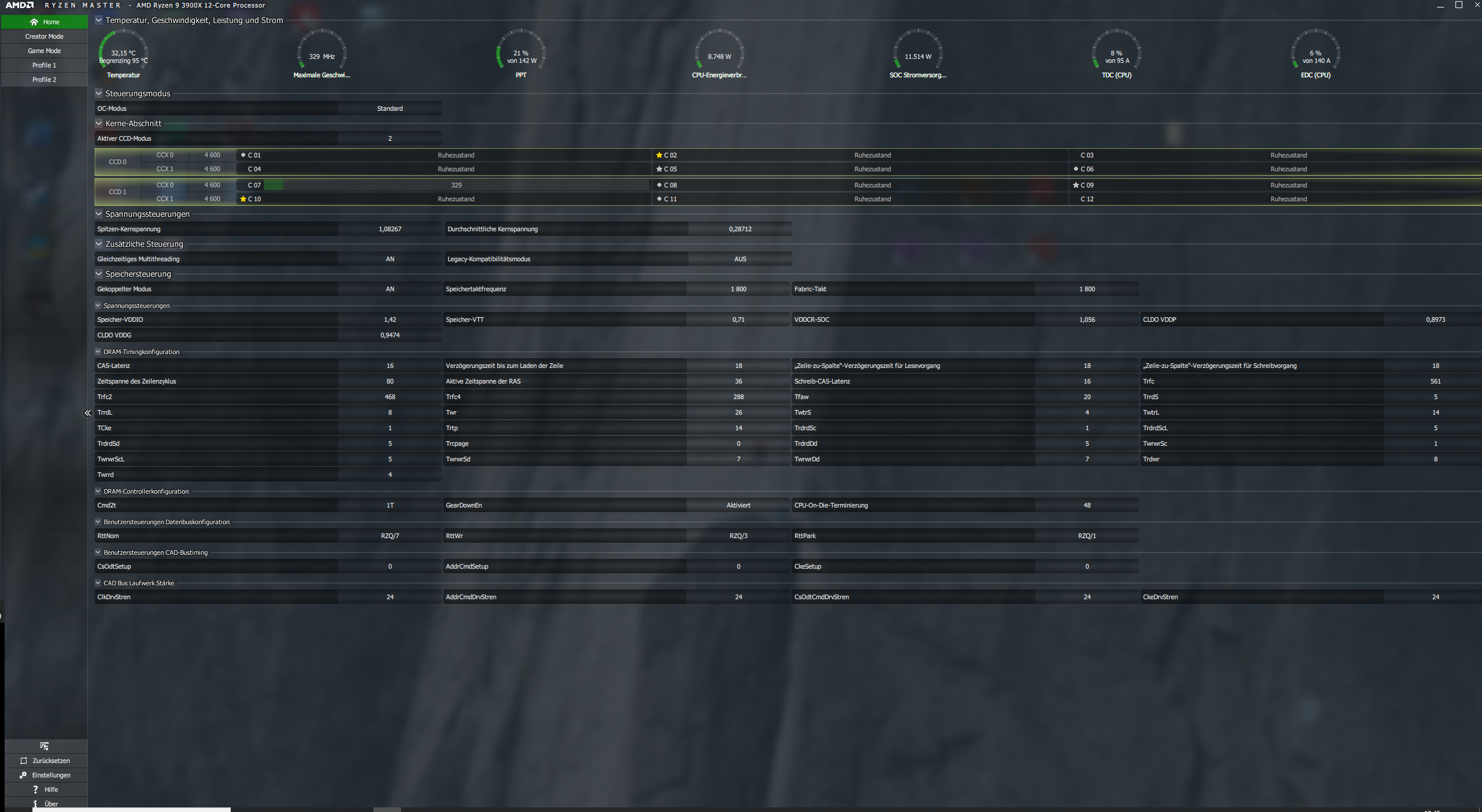 Dann wollte ich die Werte im Ryzen Master Tool eintragen, aber da sind die Bezeichnungen auf Deutsch (kein Umstellen möglich?!) und entsprechen nicht den Standards, so dass ich die Einstellungen hierzu lieber nicht übernommen habe.