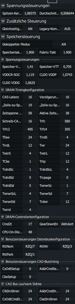 In Deinen älteren Settings KLICK MICH hattest Du ja VSOC=1,15V eingestellt und VDDG und VDDP auf "Auto" belassen. Bis Du so (mit "Auto") auf die relativen hohen Spannungen gekommen, die Du jetzt manuell bei diesen Spannungen dort eingetragen hast? War doch so richtig herum bei Dir: VDDP=1.075V, VDDG=1,065V, ne? Oder hast Du diese Spannungen durch viele Tests ausgelotet? Ich hätte ja gern etwas weniger, um meine CPU zu schonen, aber wenn Du mir jetzt sagst, dass die bei 4x 16GB Micron E-Die schon (in etwa) so hoch angesetzt sein müssen, dann würde ich das jetzt einfach dabei belassen. Die VSOC habe ich bei mir mit 1,128V im Bios aus den vorhandenen Möglichkeiten ausgewählt. (Dachte, so hält er sich vielleicht mal dran ... Niedriger konnte ich nicht gehen, weil ich in einem Youtube Gigabyte Bios Review gehört hatte, dass VDDG immer automatisch 0,05V darunter liegt. Das war dann also die niedrigste VSOC die ich nehmen "konnte" Wenn ich VDDG auf 1,065V einstellen wollte. Die VDIMM Habe ich beim Karhu Test auf 1,41 V im Bios eingestellt (HwiNFO liest da jetzt 1,428V aus - dachte das passt dann). Wie gesagt, jetzt ärgere ich mich fast, weil ich denke, dass es 1,4V auch getan hätten (lt. HWinfo 1,416V). Damit war Aida64 anfangs im Stresstest ja auch zufrieden. Außerdem bilde ich mir ein, dass jetzt die CPU im Aida-Stresstest inkl. FPU auch ein paar Grad Celsius heißer geworden ist, was mir gar nicht passt, denn die Spitzen gingen kurzzeitig über 90°C.