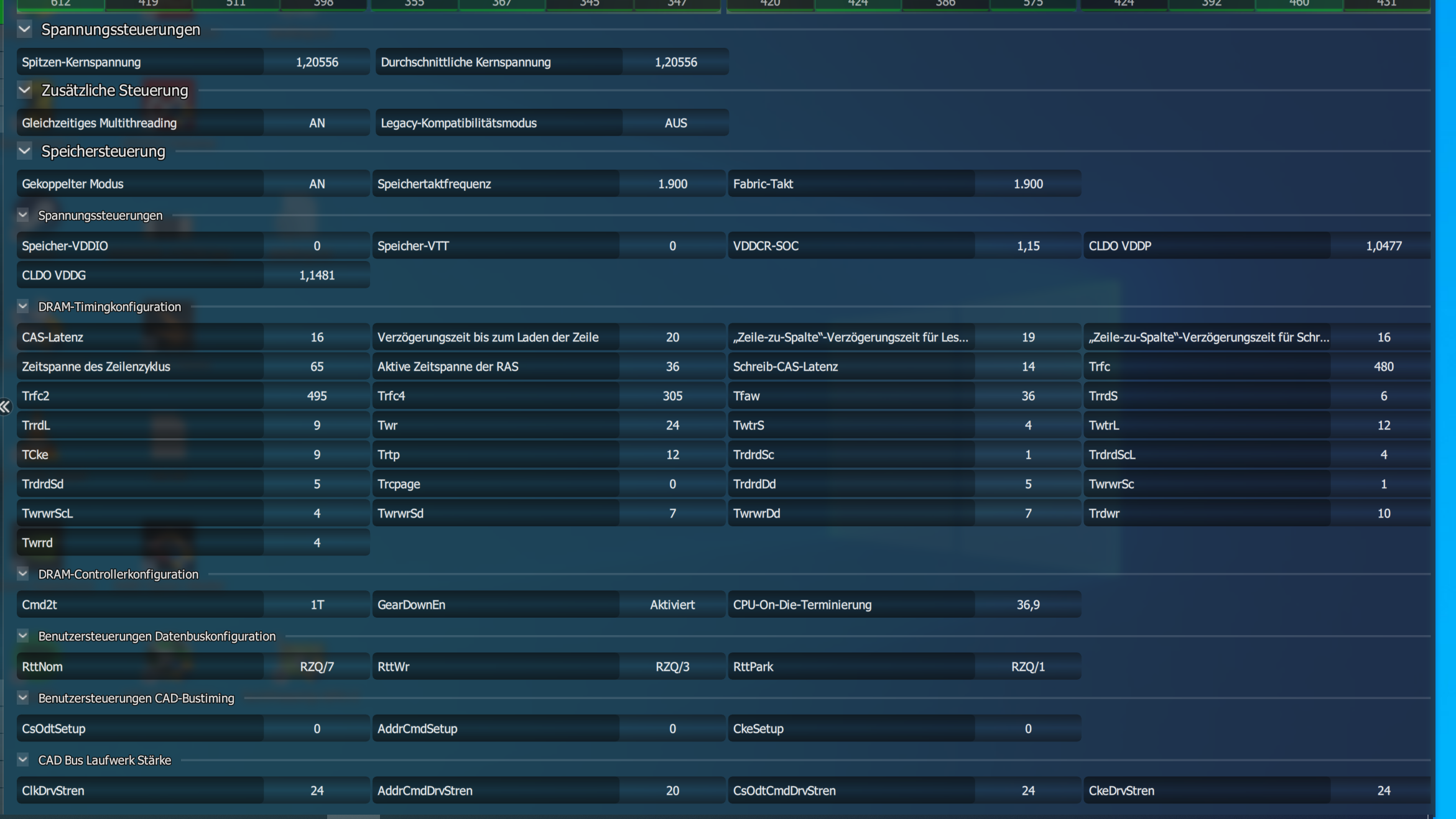 Hier ein Screen vom Ryzen Master mit den aktuellen Einstellungen. (Ram steht auf Auto damit der PC startet daher die 2400).