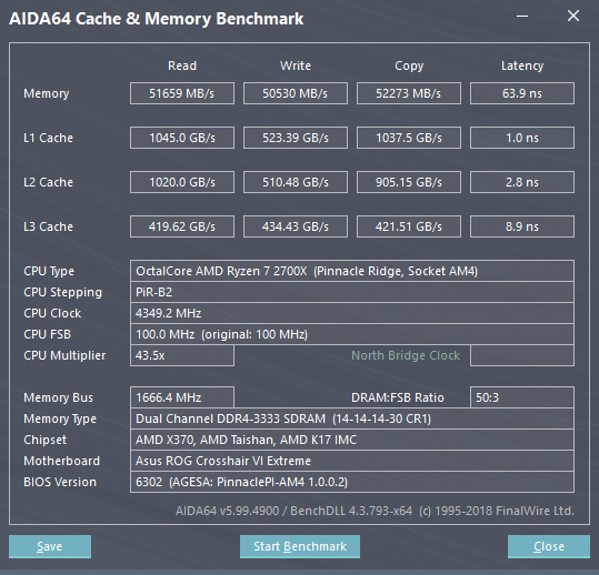 Read, Write und Copy bewegen sich bei ~ 49k und die Latenz liegt bei ~ 62,4 ns.