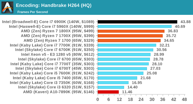 Intel I7 ? 10 min weniger ? - tut sich nicht viel ... , was ich zu den Grafiken unten sagen muss - sie stammen vom 02.03 - seitdem hat sich einiges getan , insbesondere der Ryzen balanced Plan sorgt bei mir unter Handbrake für 2 - 3 Frames mehr die sec ( h264 ). H265 hab ich noch nicht soviel encodiert , erst 2 - 3 Filme um zu sehen wieviel es einspart an Filegrösse , da zur Zeit allerdings nur mein Computer H265 abspielen kann , habe ich aus Kompatibilitätsgründen in h264 encodiert
