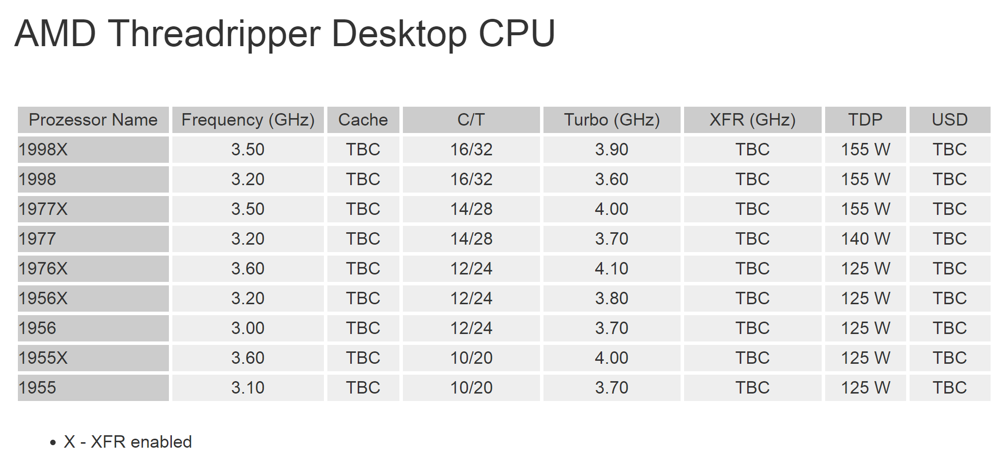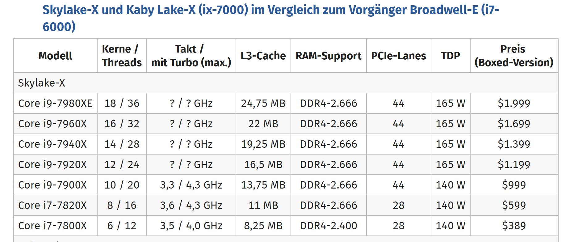 Im Turbo dürften die alle nahe bei den 4,5GHz sein, der derzeit gerüchteweise bei einigen Modellen als maximaler Takt genannt wird. Der Grundtakt auch des 18 Kerners dürfte schon eine 3 vorne stehen haben, aber diese Angaben ist heute schon fast wertlos, zumal ja Intel schon bisher bei Xeons die Taktraten auch unter den Grundtakt senkt, wenn besonders leistungsfressende Befehle wie die AVX Befehle genutzt werden und da Skylake-X auch AVX512 unterstützt, dürfte bei intensiver Nutzung dieser Befehle der Takt noch deutlicher unter den Grundtakt rutschen. Andererseits erlaubt der Turbo es auch bei last auf allen Kernen über dem Grundtakt zu arbeiten, sofern Leistungsaufnahme und Temperatur im Rahmen bleiben. Genau wie bei der TDP die kaum noch was über die reale Leistungsaufnahme aussagt, sagen die Taktraten immer weniger über den Takt aus mit dem die CPU dann tatsächlich arbeiten wird.