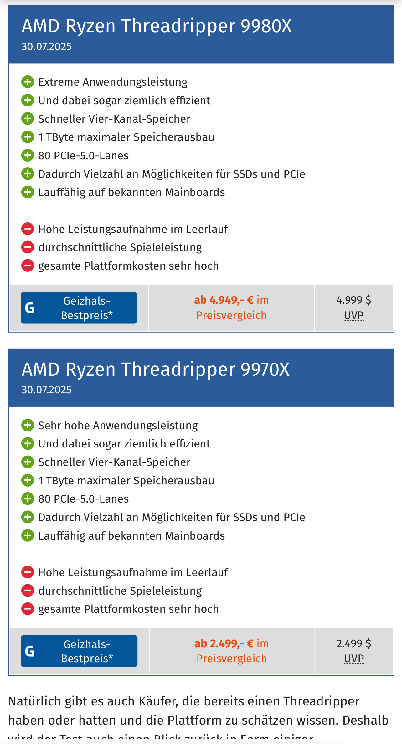 Die Gaming-Leistung bei einem Threadripper als Nachteil aufzulisten ergibt nur dann Sinn, wenn man vorher den Einsatzzweck komplett ignoriert hat. Das ist, als würde man einem LKW vorwerfen, dass er keine Bestzeit auf der Nordschleife fährt. Völlig am Einsatzzweck vorbei.