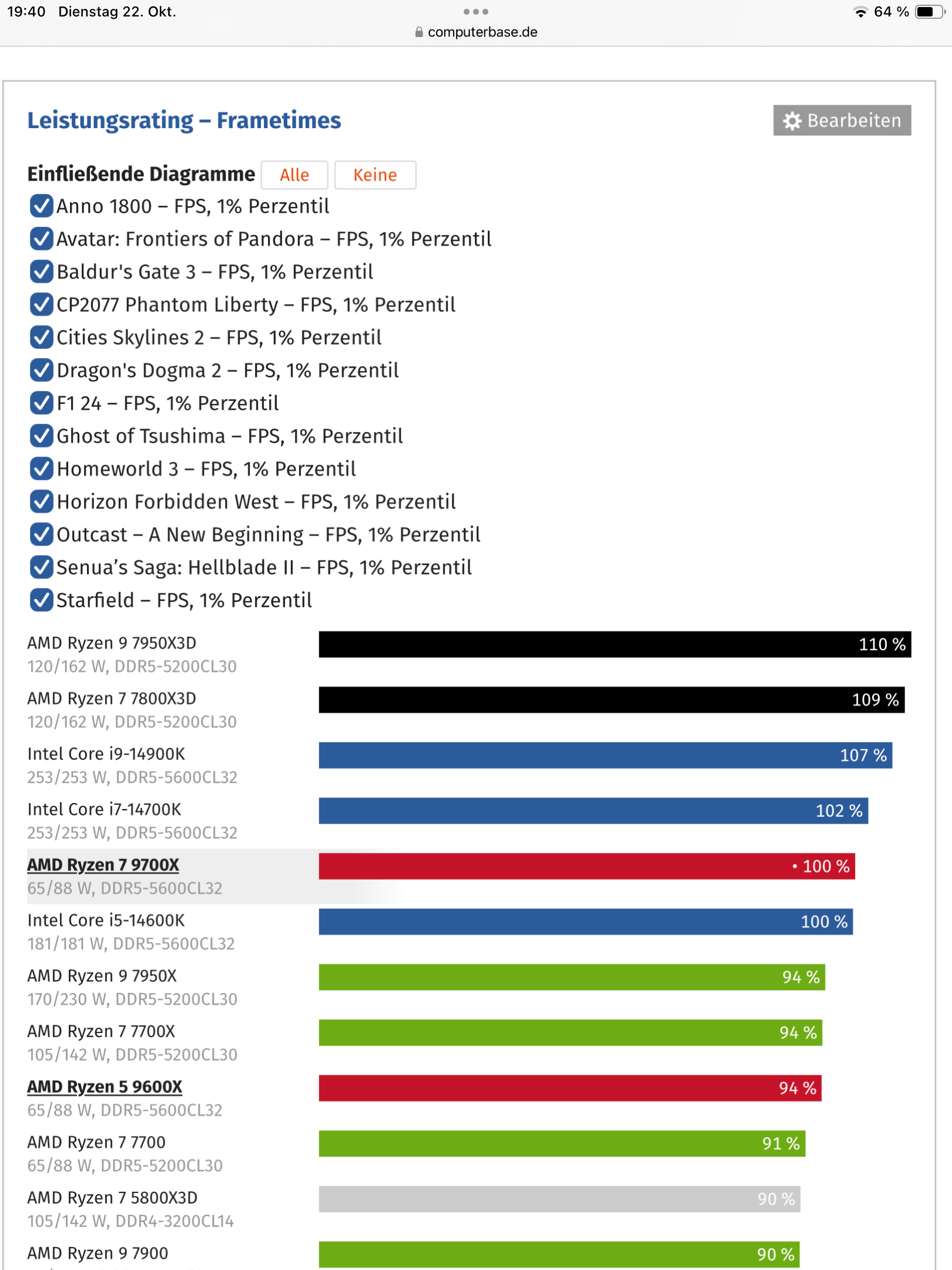 Wenn ich die CPU Rangliste, also die ohne die Patches, mit dieser hier vergleiche und hier die Spiele rausnehme die in der Rangliste fehlen, liegt der 14900K 8% vor dem 9700X ohne die Patches und hier sind es jetzt 6%.
