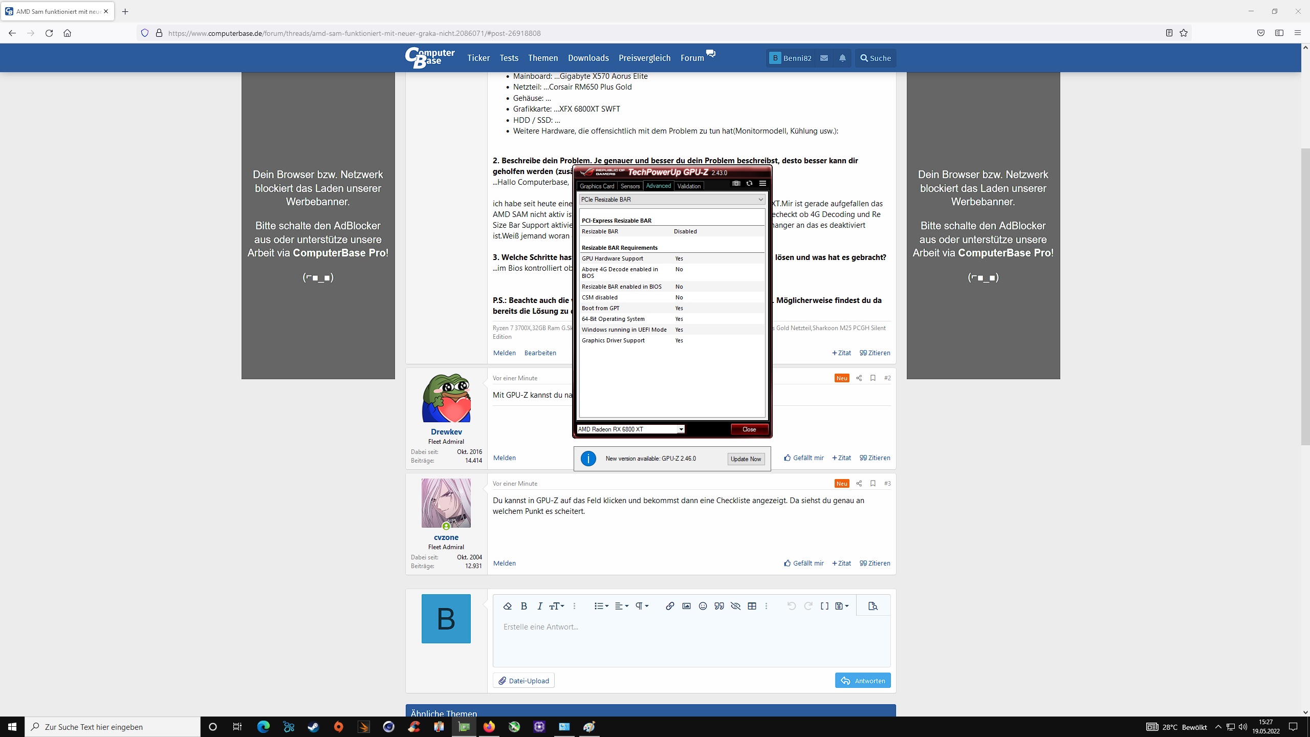 ich habe seit heute eine neue Grafikkarte(XFX6800XT SWFT.Komme von einer 5700XT.Mir ist gerade aufgefallen das AMD SAM nicht aktiv ist,mit der 5700XT ging es noch.Bin dann ins Bios und habe gecheckt ob 4G Decoding und Re Size Bar Support aktiviert ist was der Fall ist.Trotzdem zeigt GPU-Z und der gerätemanger an das es deaktiviert ist.Weiß jemand woran das liegenb kann?