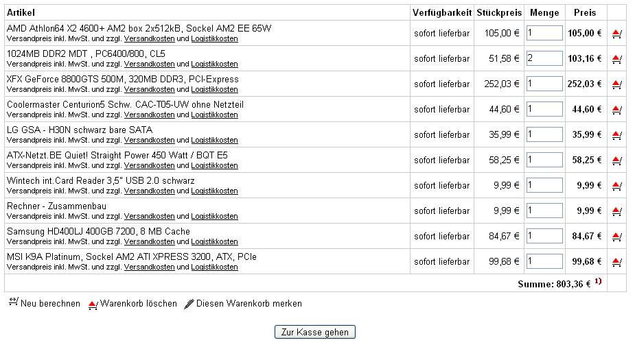 Das Ganze für schlappe 800 Euronen. Um die 60 Monate Garantie zu bekommen und den Preis zu halten (ist ein EK-Preis), kann sie jetzt natürlich nicht auf andere Händler zurückgreifen. Ein Tausch einiger Komponenten wäre aber denk- und machbar.