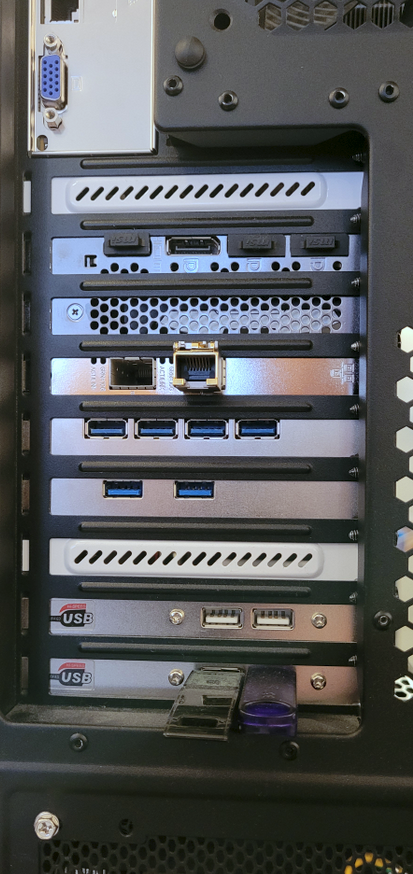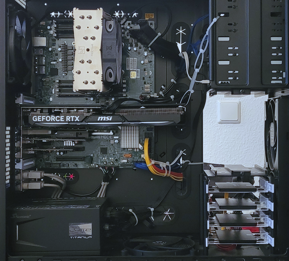 Durch den Einbau einer RTX4070 (Modellvariante, die nur 2 Sockelbreiten benötigt) habe ich sogar noch einen wertvollen PCIe 3.0 x8 Sockel zurückgewinnen können, um eine 10 GBit Karte einzubauen (Intel X710-DA2).