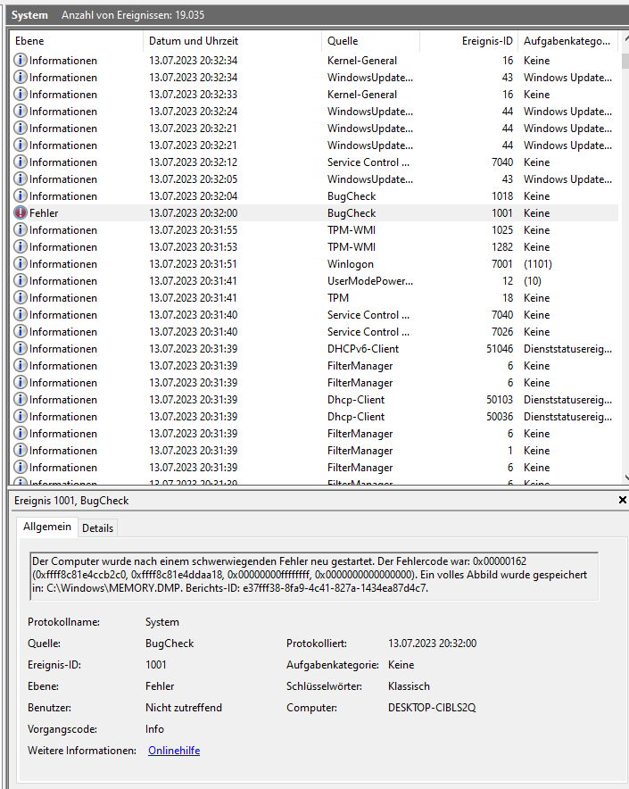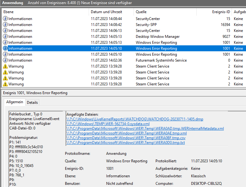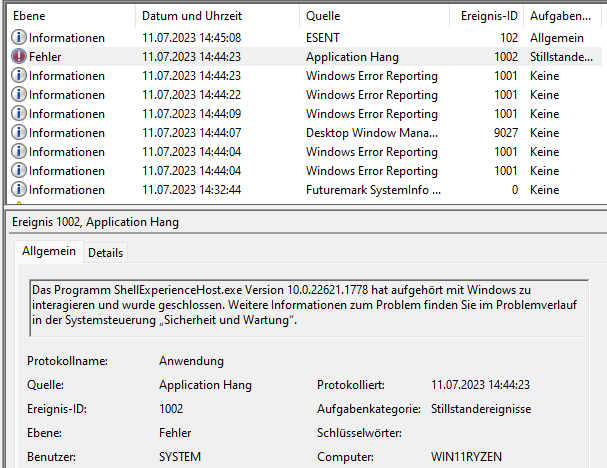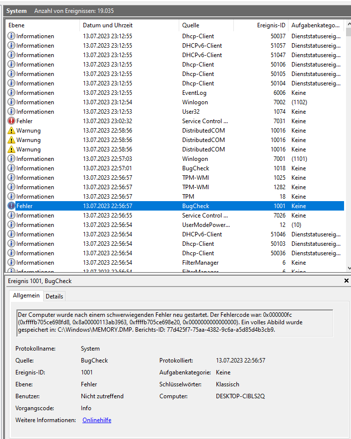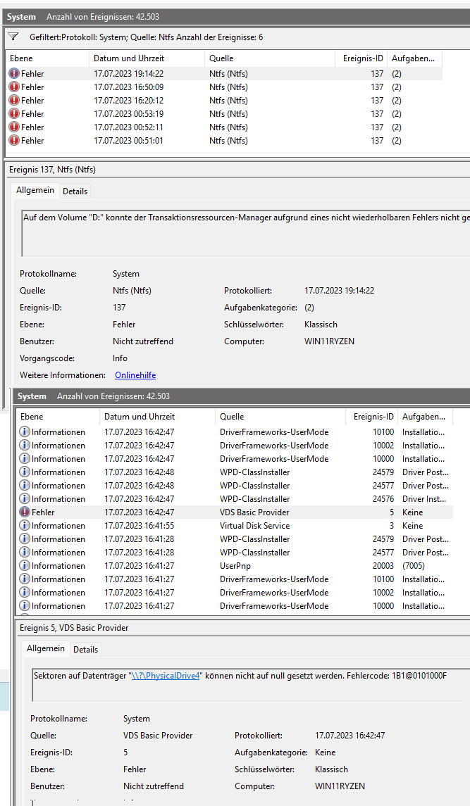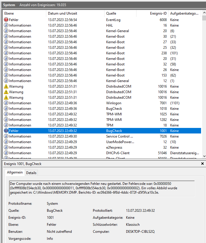 ich muss den Thread leider weiterführen, da ein anderes Netzteil (Seasonic Focu PX550) auch keine Lösung brachte. Das hatte ich am 18.08.23 erstmals eingebaut, als schon der 5600G drin war. Da gab's keine Probleme (der Prozessor braucht auch wesentlich weniger Strom), weswegen ich zum Gegentest am 23.08. nochmal das alte Rush Power M400 eingebaut habe.