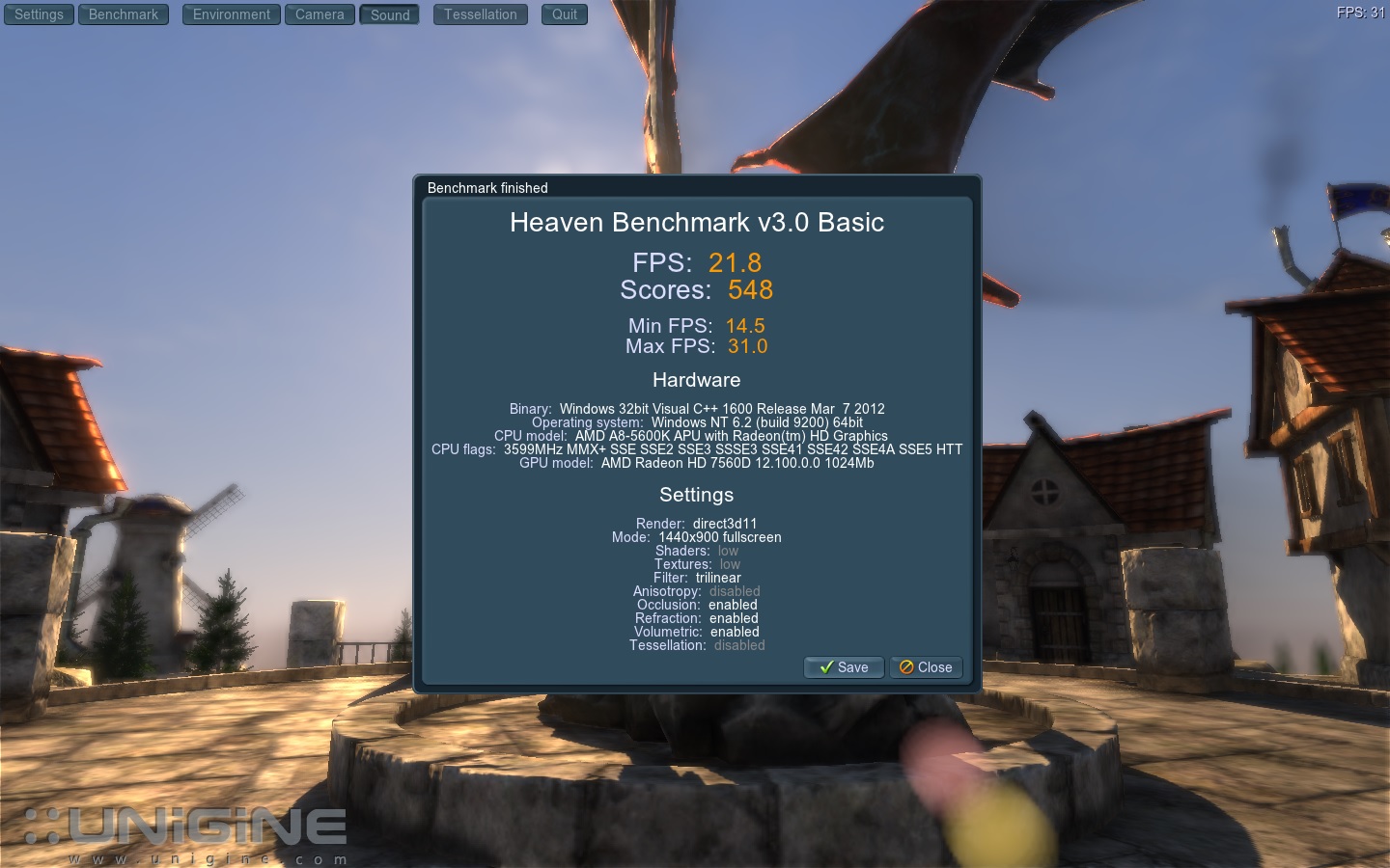 Heaven Benchmark 3.0: 12,2 FPS bei 1600 x 900 ohne AA, alles auf Low